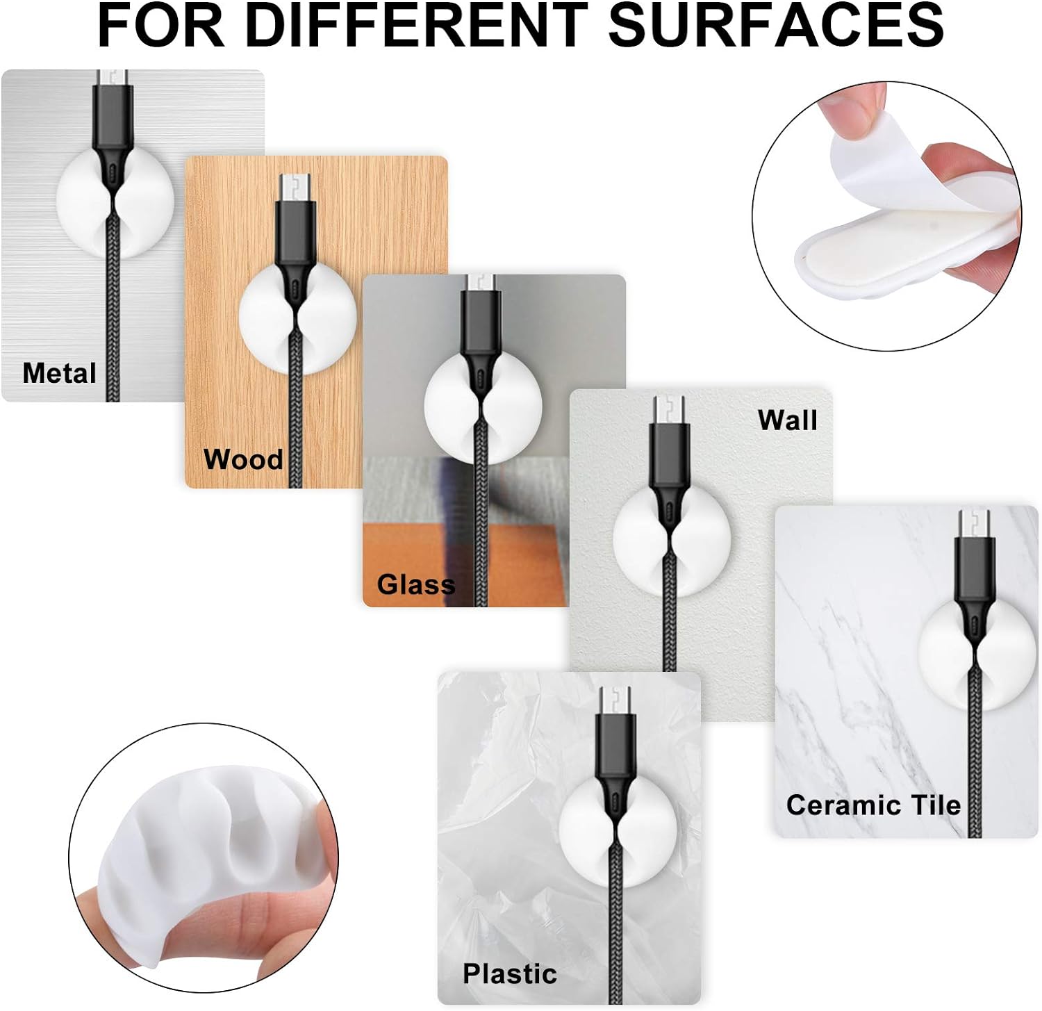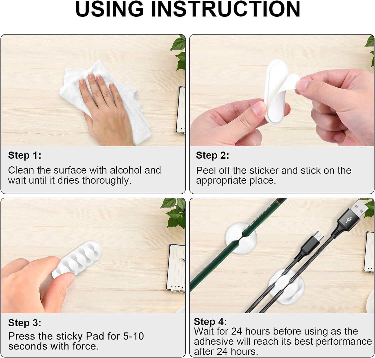 【Easy To Use】You can easily attach them to horizontal and vertical surfaces. Firstly, clean the surface and wait until it dries thoroughly. Secondly, peel off the sticker and stick on the appropriate place. Thirdly, press the sticky Pad for 5-10 seconds with force. Then wait for 24 hours before using and you can start to manage your cords