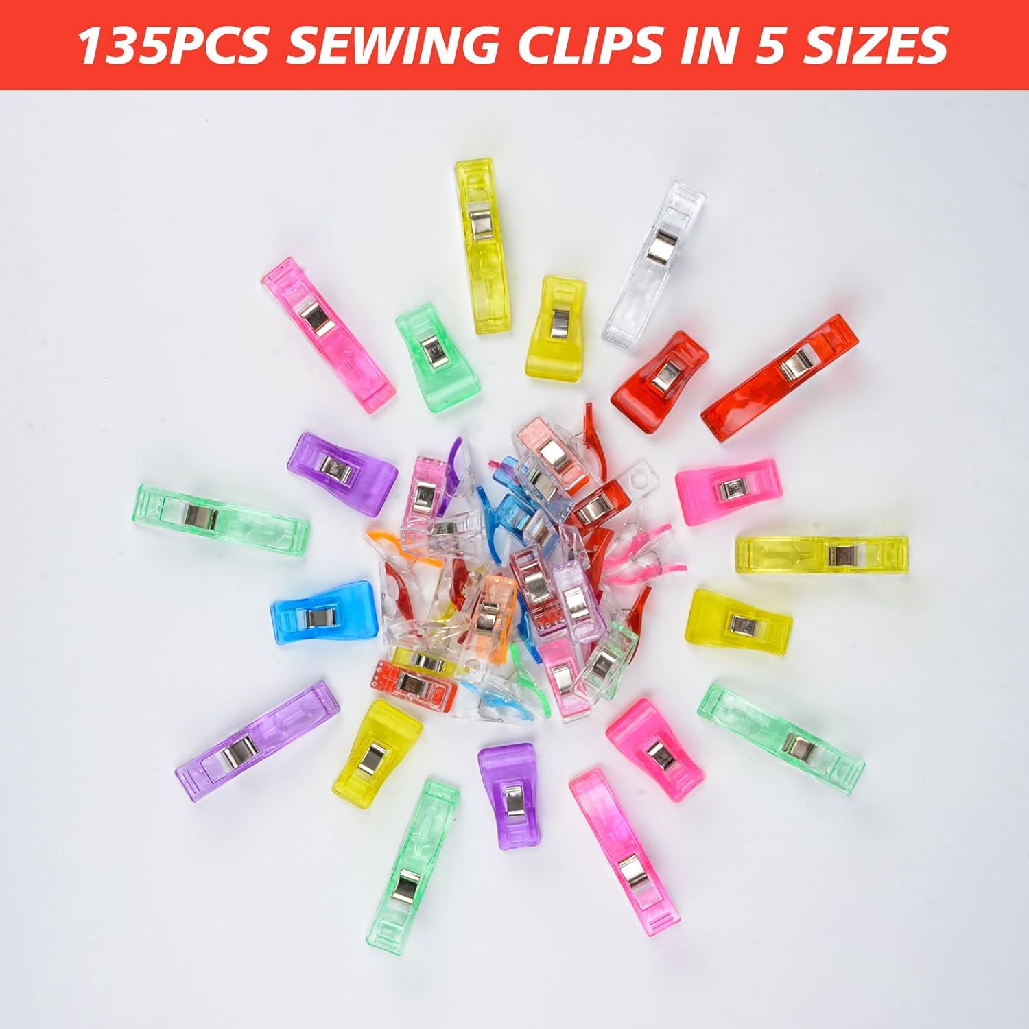【Multiple Sizes & Colors】The package includes 135 pieces of sewing clips in 5 different sizes. (55pcs 27*10mm/50pcs 27*4mm/10pcs 38*11mm/10pcs 55*12mm/10pcs 33*18mm) . A variety of bright colors and different sizes to make your sewing work more convenient