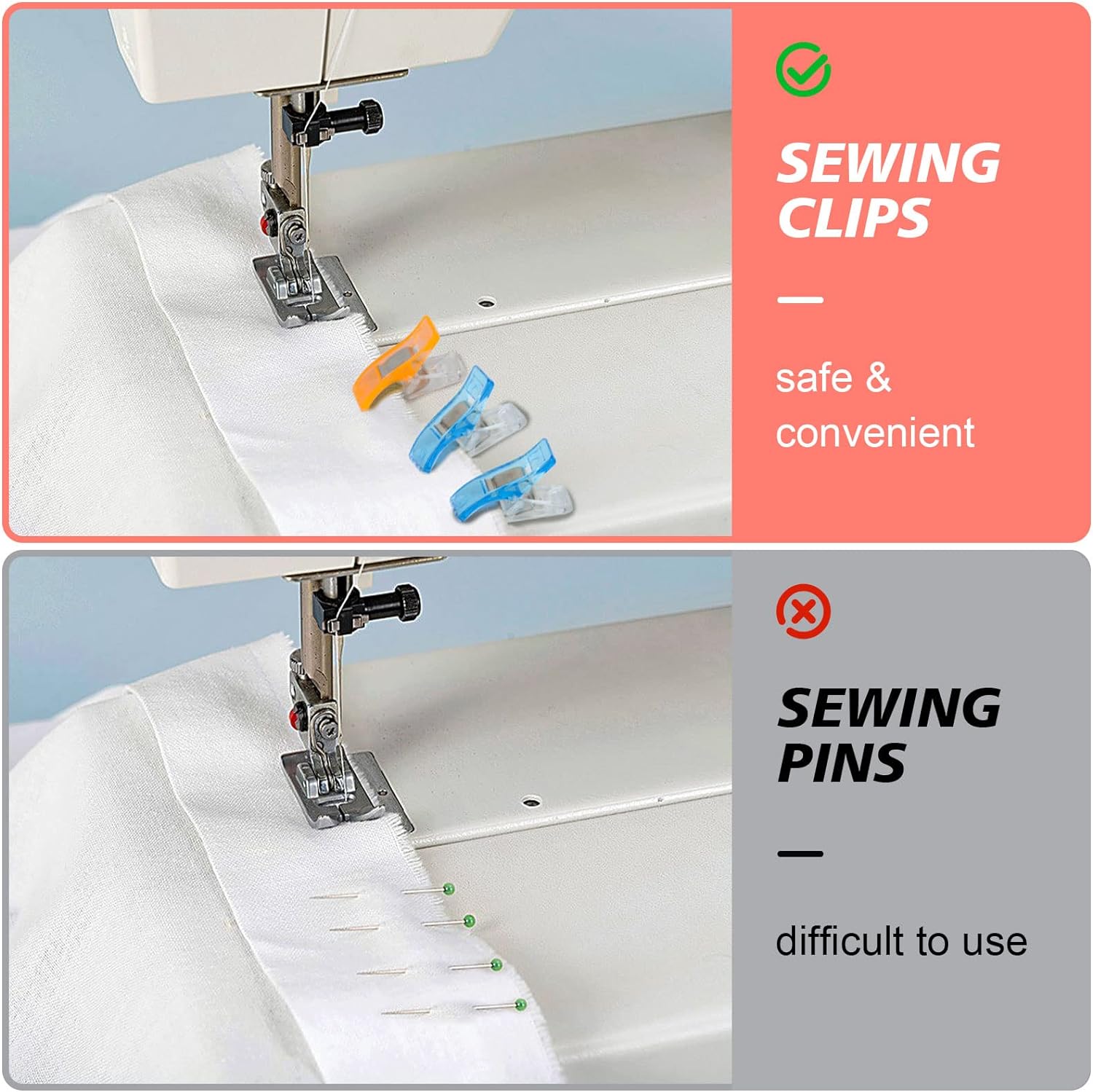 【Sew Safely】The fabric sewing clips are safer than sharp pins, you can enjoy your sewing time without worrying that the plastic craft clips will poke your fingers or damage your material like pins