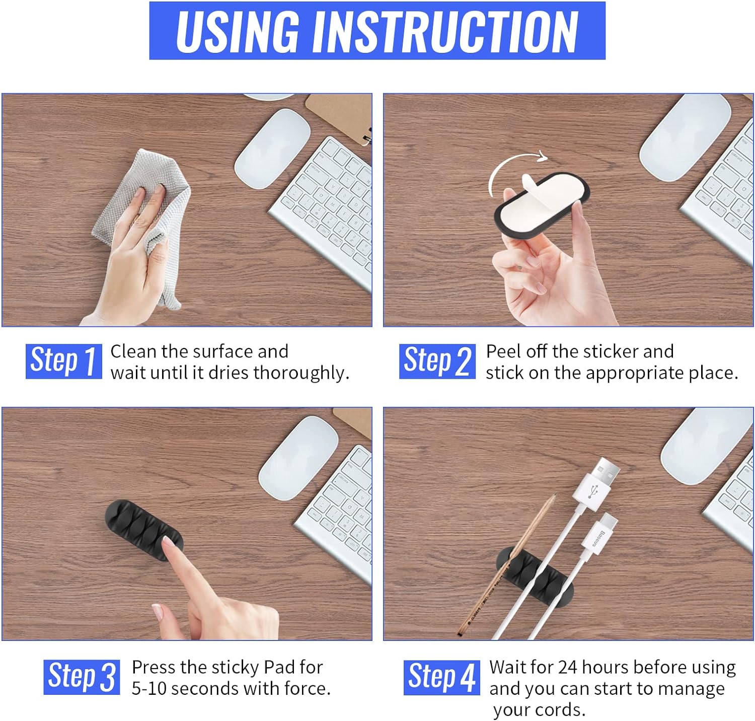 Easy to Install: Firstly, clean the surface and wait until it dries thoroughly. Secondly, peel off the sticker and stick on the appropriate place. Thirdly, press the sticky Pad for 5-10 seconds with force. Then wait for 24 hours before using and you can start to manage your cords