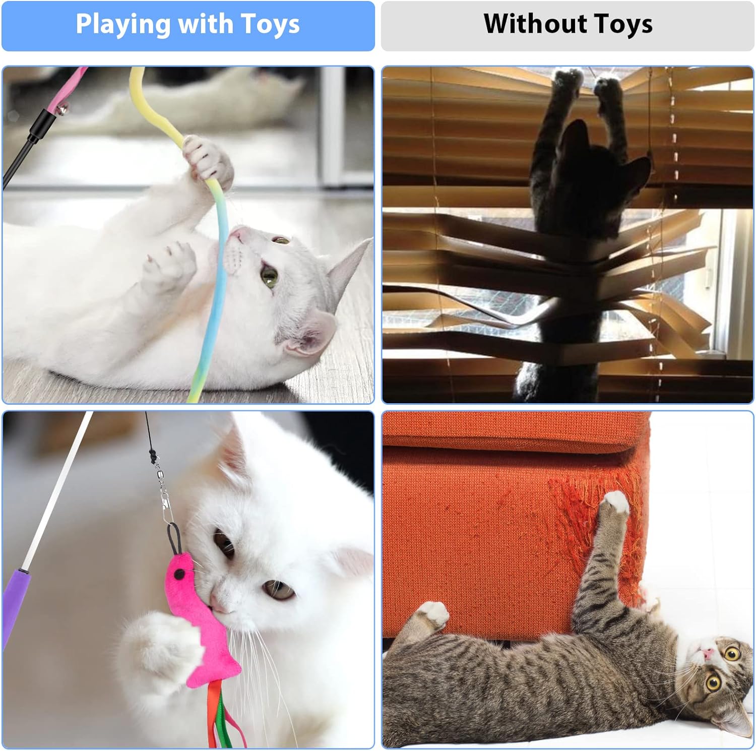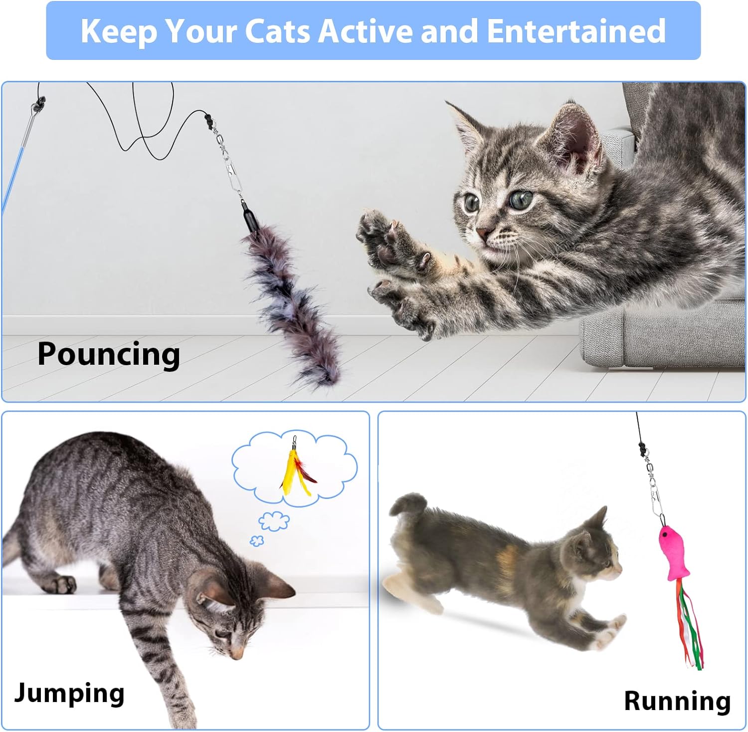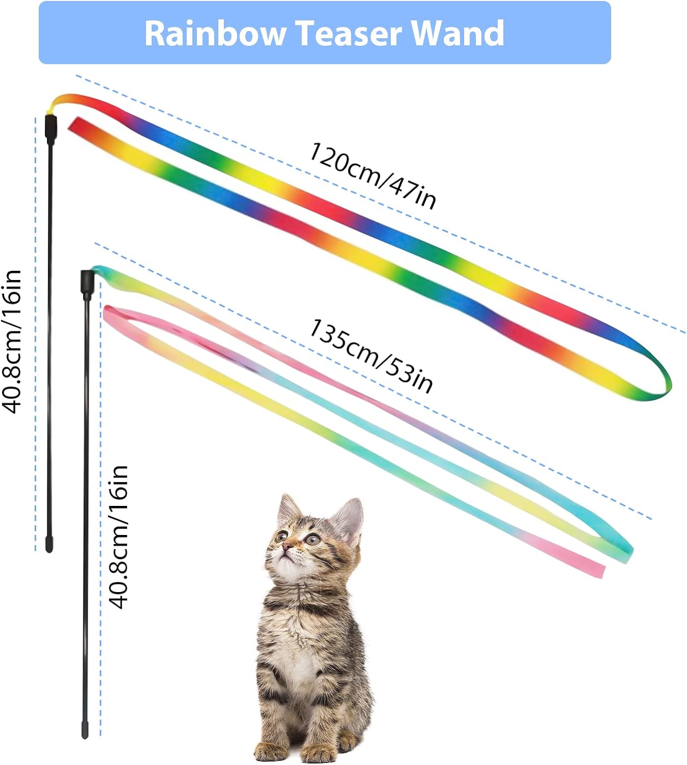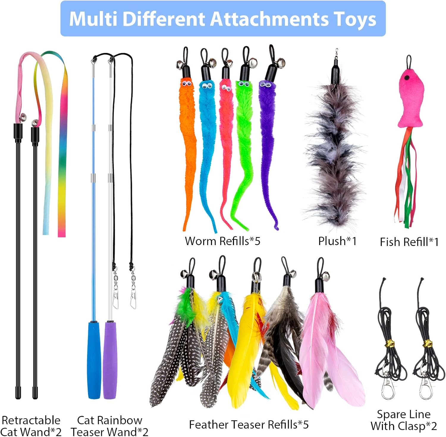 Great Value Cat Toy Set: You will get 2pcs retractable cat wand, 2pcs cat rainbow teaser wand, 2pcs spare line with clasp, 5pcs worm refills, 5pcs feather teaser refills, 1pc plush and 1pc fish refill. Various attachments cat toy for long time entertainment.
