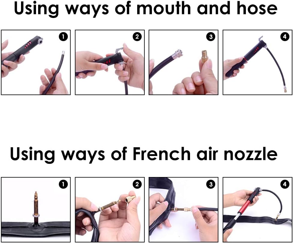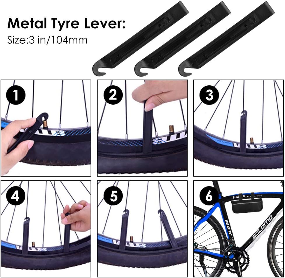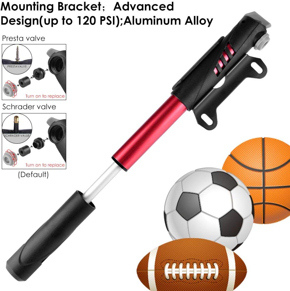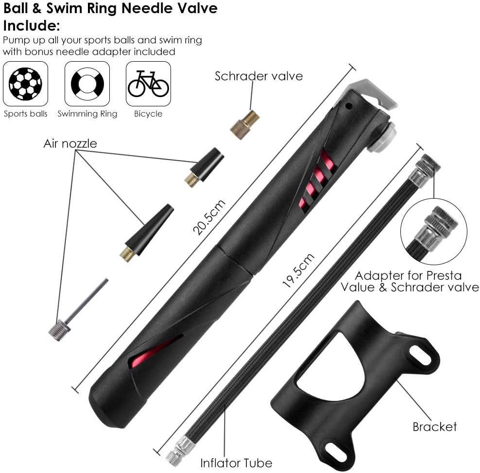 【Complete and versatile bicycle repair kit】. Includes a precise 120 PSI mini bike pump / a Flexible hose with nozzle adapter / Stand / metal file / Schrader valve / Ball needle / 3 tire tourniquet / 2 Air nozzles / 2 Screws / 8 Tire patch / 16 in 1 Screwdriver repair tool / Bike saddlebag.