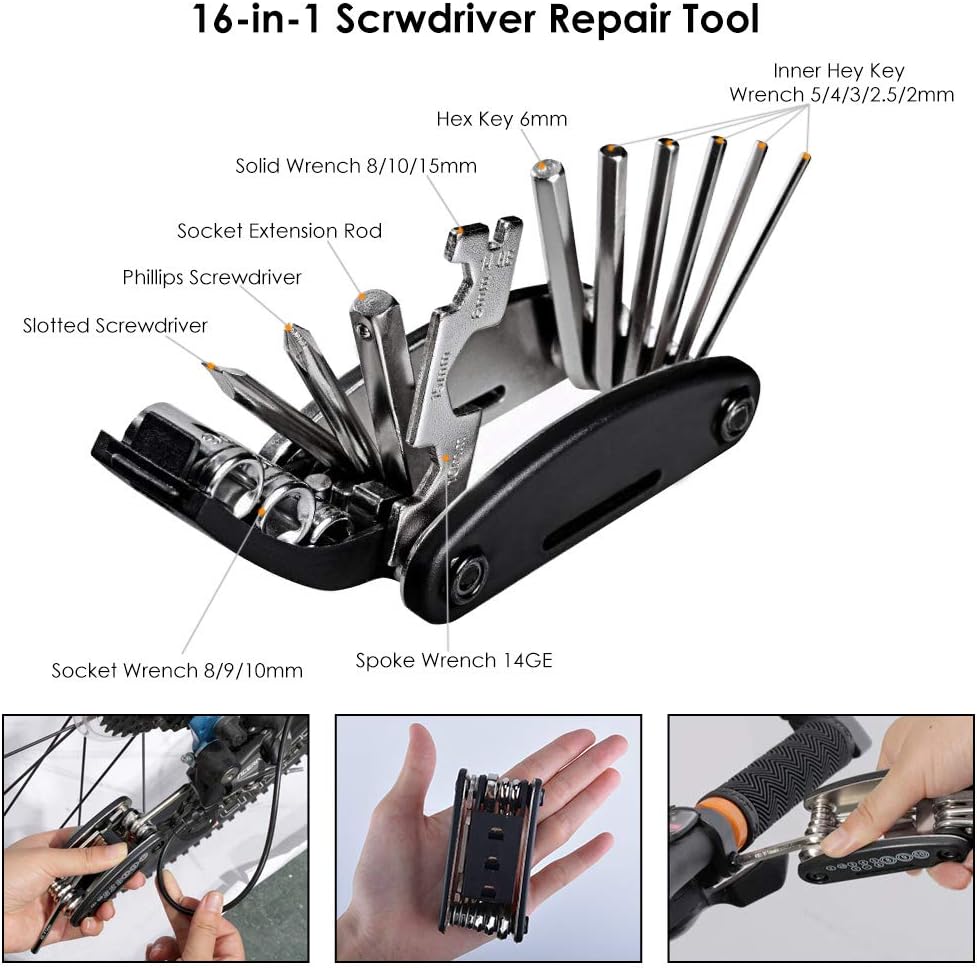 【16 in 1 Bicycle Multi Tool】. Fix most bike problems with this 16 all-in-one tool: 8/10/15mm solid wrench, Phillips screwdriver, 8/9 / 10mm socket wrench, socket extension rod, Phillips screwdriver, Spoke wrench, 2 / 2.5 / 3/4/5 / 6mm hex wrench.