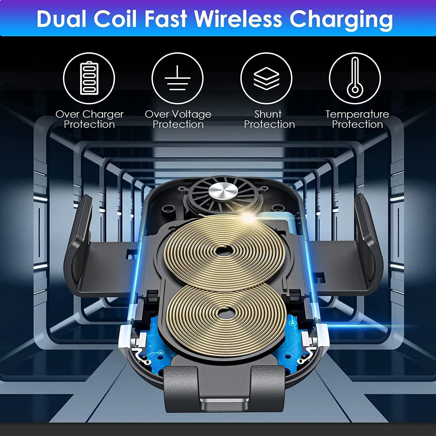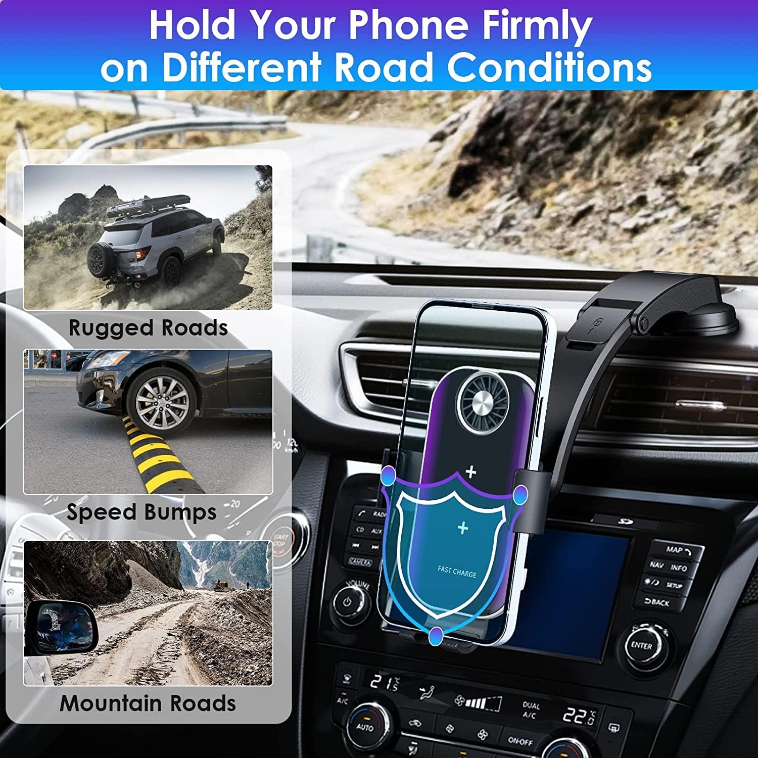 Smart car clamping mobile phone holder car with charging function comes with a quiet electric motor, the automatically controlled arms make the charging process intelligent. Press the release button of the wireless handset holder and open your phone automatically and start. The built-in cooling fan on the back improves charging efficiency at high temperature.