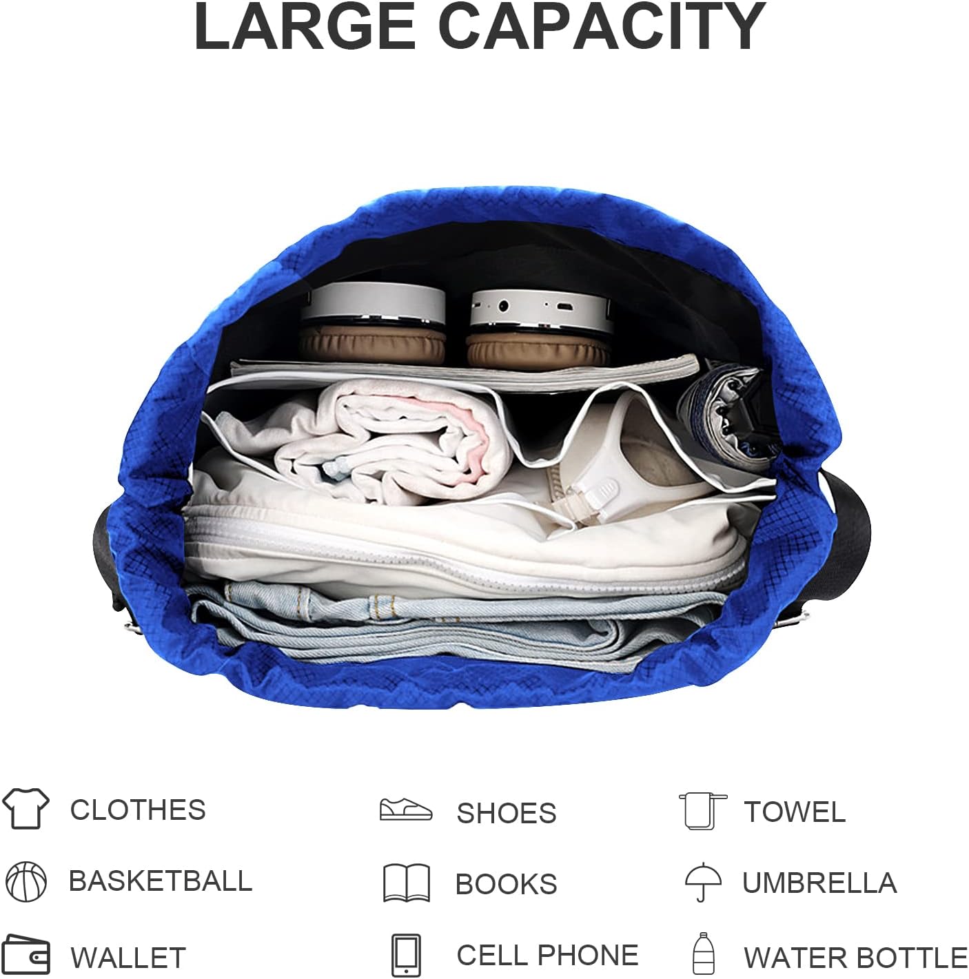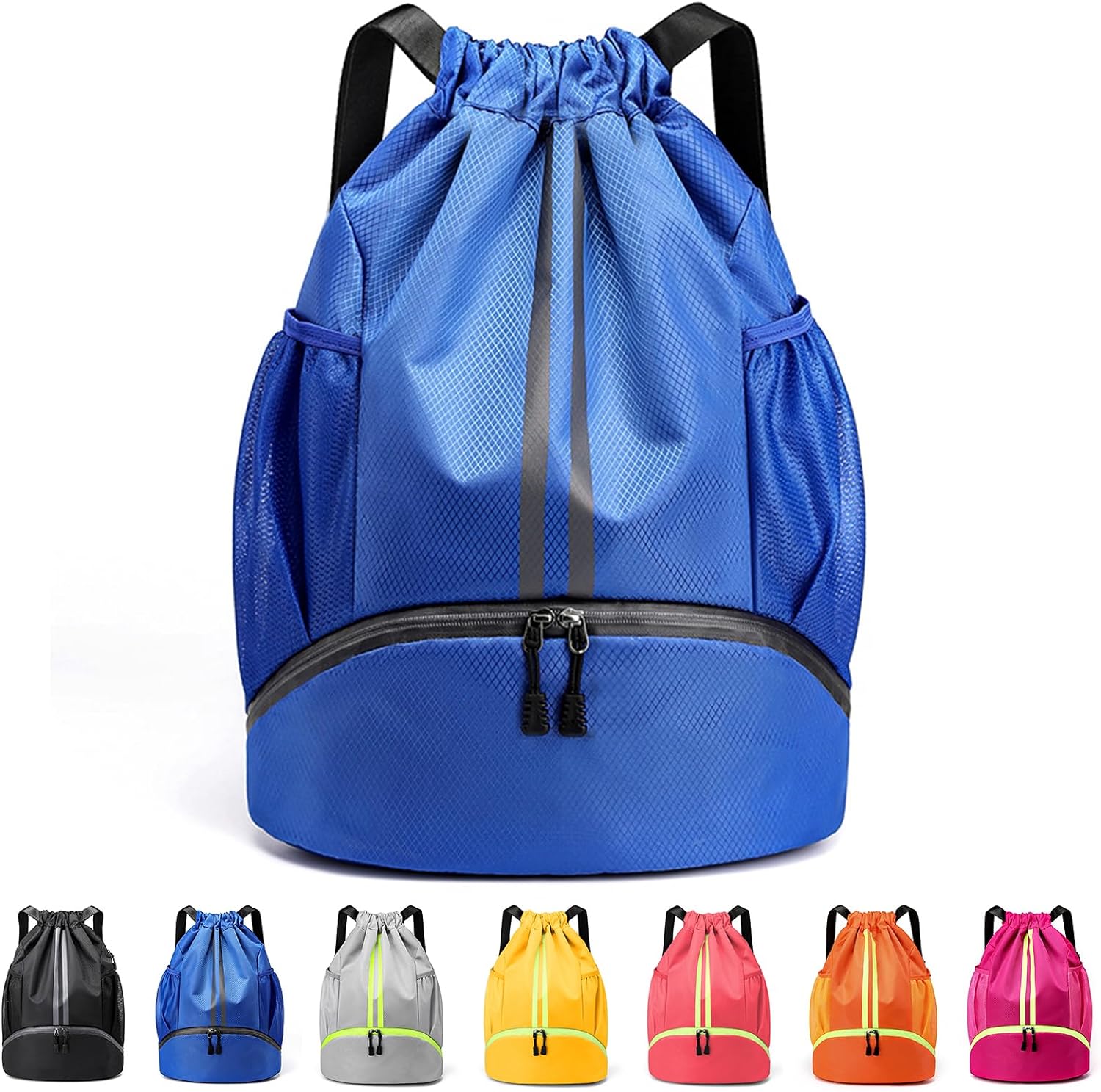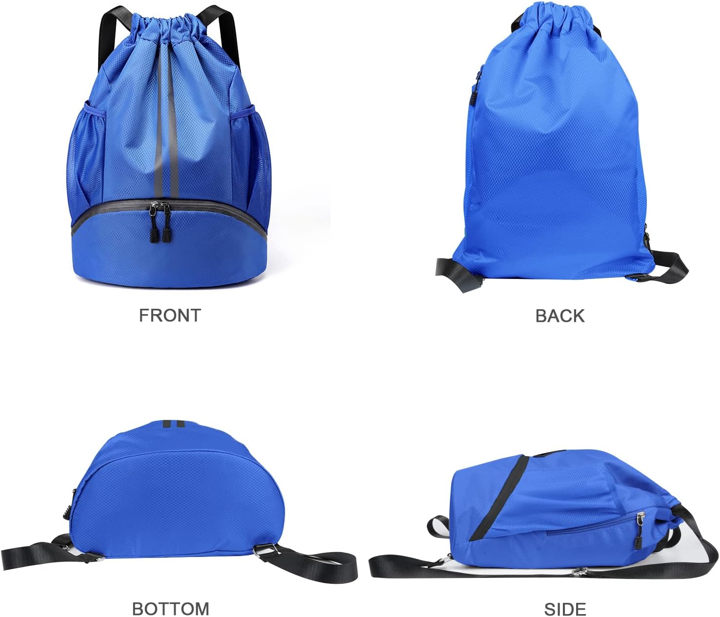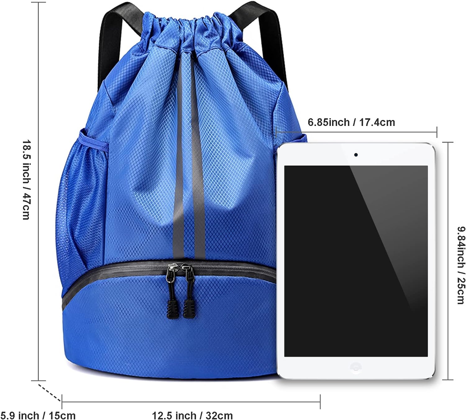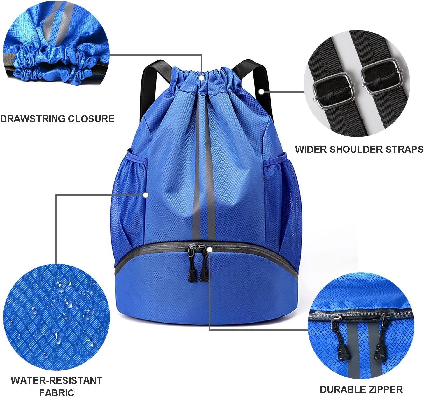 Drawstring Backpack with Mesh Pockets Shoe Compartment Water Resistant (Blue)