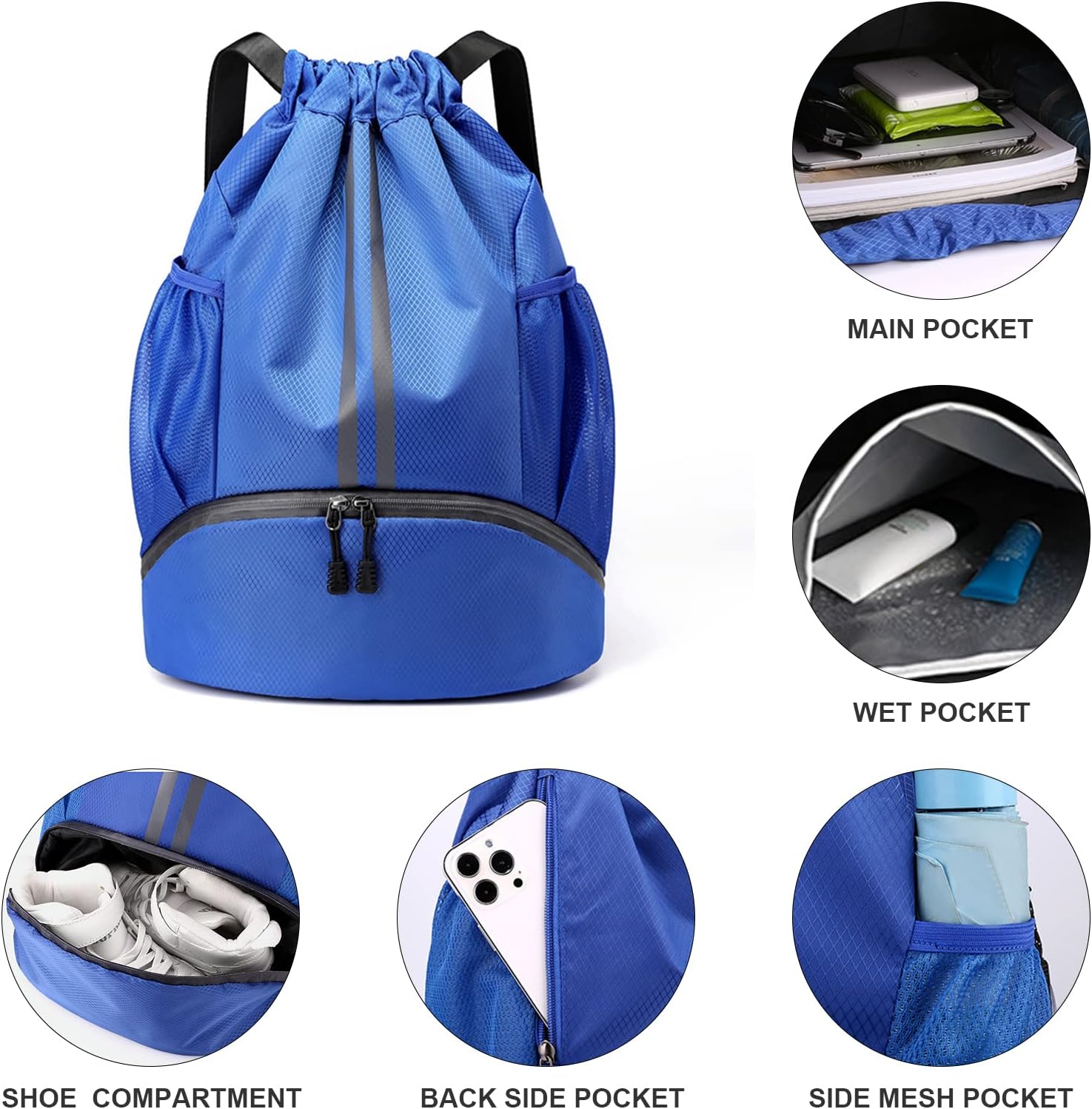 【Multi-Pocket Design】The drawstring backpack is designed with multiple pockets. There is 1 main pocket, 1 wet pocket, 2 side mesh pockets, 1 back side pocket and 1 shoe compartment. This drawstring bag has enough space to store different items