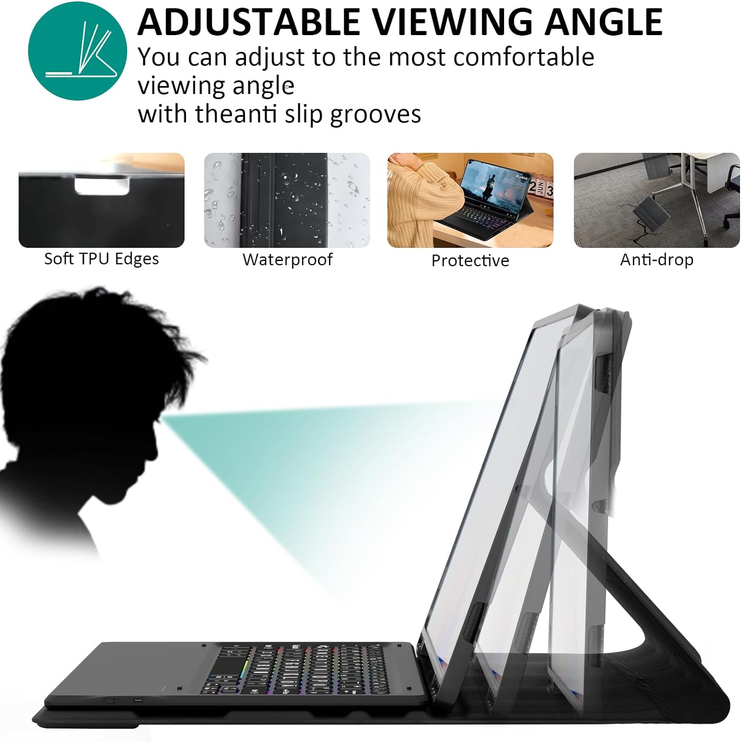 【Detachable Magnetic Keyboard And Adjustable Stand】Contains a removable, magnetic, portable Bluetooth keyboard case. Enjoy a 50°changeable viewing angle with 3 adjustable viewing angles supported by built-in anti-slip grooves. Ideal for use at work, home, school, on the road, or for business. For more flexibility, take the keyboard off when typing is not required.
