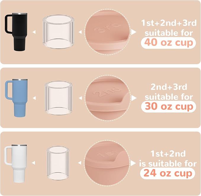 3 SIZES OF ICE CUBE MOULDS: Our silicone ice cube trays for Stanley cups make 3 different sizes of hollow cylinder ice cubes, perfect for Stanley 24-40 oz. nonpareils. You can adjust the combination of ice cubes according to the size of the nonpareil: 1st + 2nd for 24 oz cups; 2nd + 3rd for 30 oz cups; 1st + 2nd + 3rd for 40 oz cups;