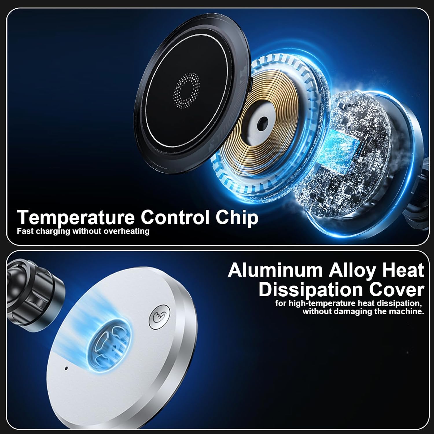 - 【N52 Strong Magnetic Force for Stable Charging】 The car phone holder wireless charger is equipped with N52 magnets that provide a pulling force of 18KG, and equipped with new upgrade vent clip, don't worry about dropping your phone while driving, ensuring stability when used on any road surface, even on extremely bumpy roads. It adopts a constant closed magnetic field, which does not affect the phone signal.