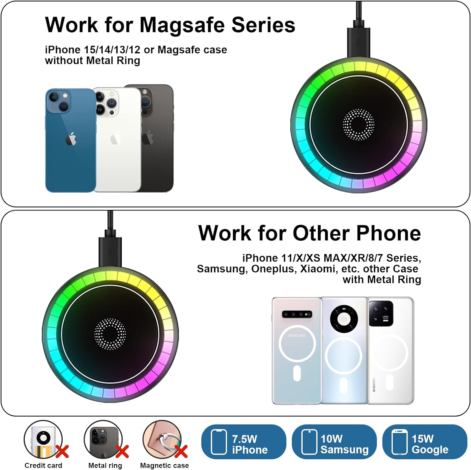 - 【Wide Compatibility】 The wireless car charger is compatible with most Qi enabled devices, such as iPhone 14/13/12/11 Mini/Pro/Pro Max iPhone X/XR/XS Max/8/8 Plus, Samsung Galaxy Z Flip/Fold/S23/S22/Note Series, Huawei/Google/LG. Comes with magnetic metal ring, even the non-magnetic iPhone 8-11 can be used. Note: It is only compatible with the Mag-Safe phone cases without magnetic metal ring.