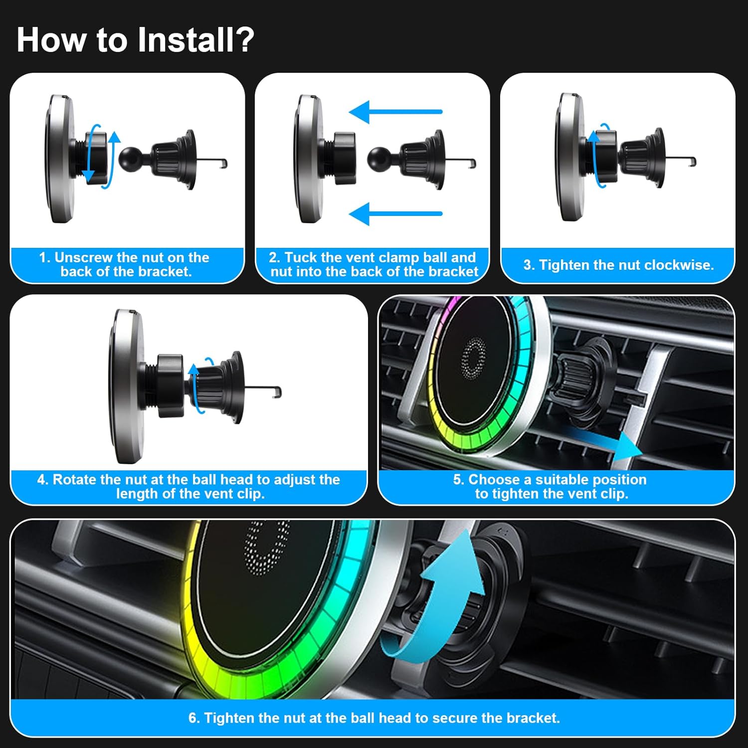 - 【Phone Car Mount with Colorful Light】The wireless car charger with LED backlight provides a more intuitive display of charging status, minimizing interference and providing a safer driving experience, and it has 7 light effects, flashing display based on sound, creating the perfect ambience for every driver's experience, which can create a comfortable atmosphere or a vivid, bright and refreshing driving atmosphere.