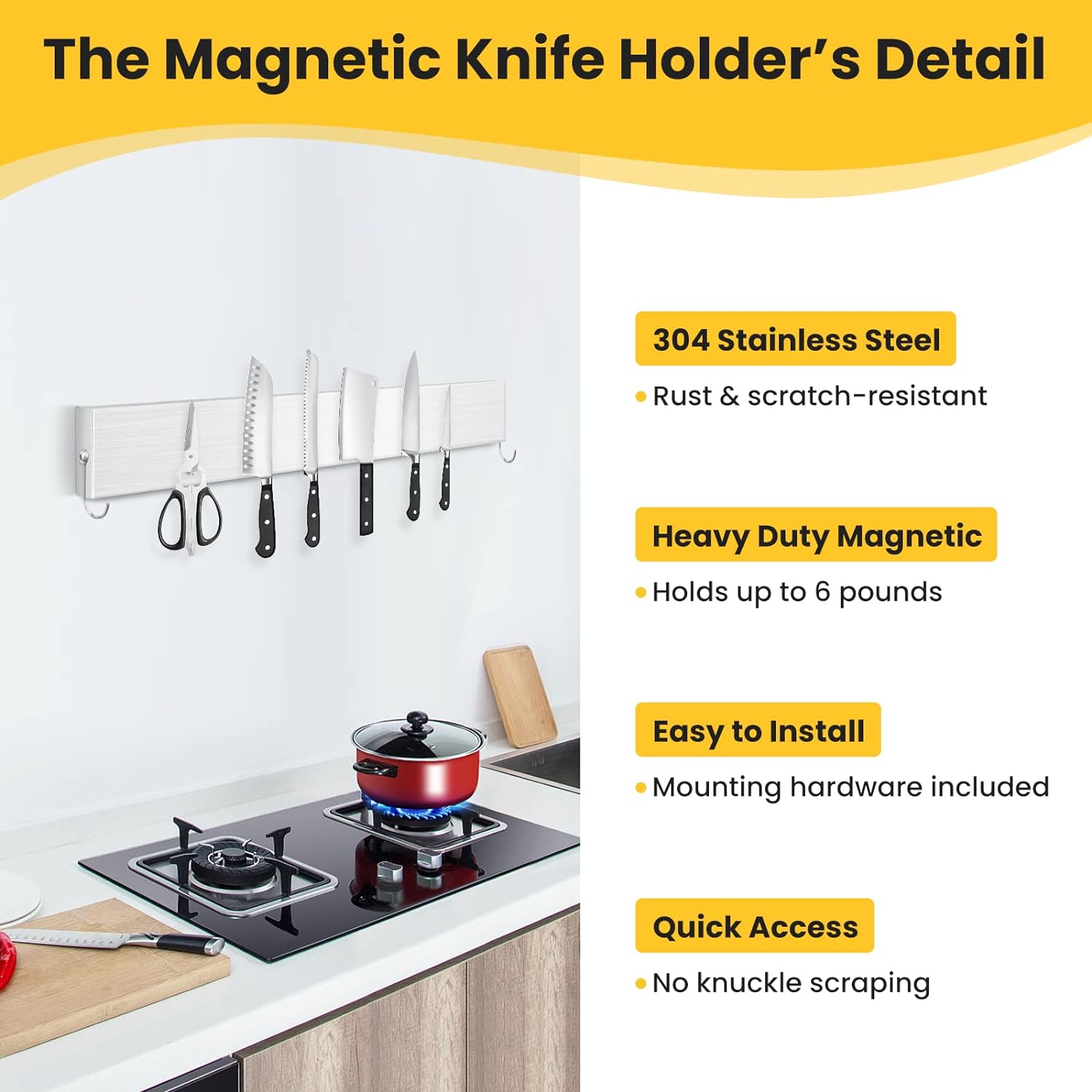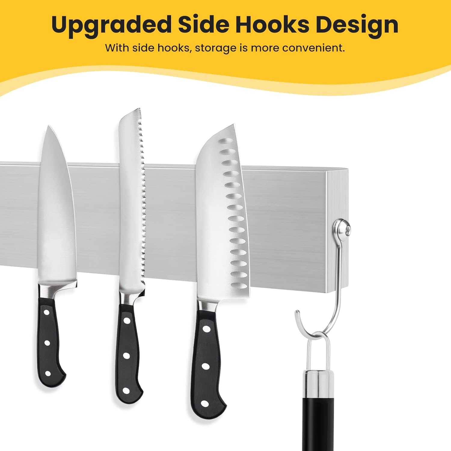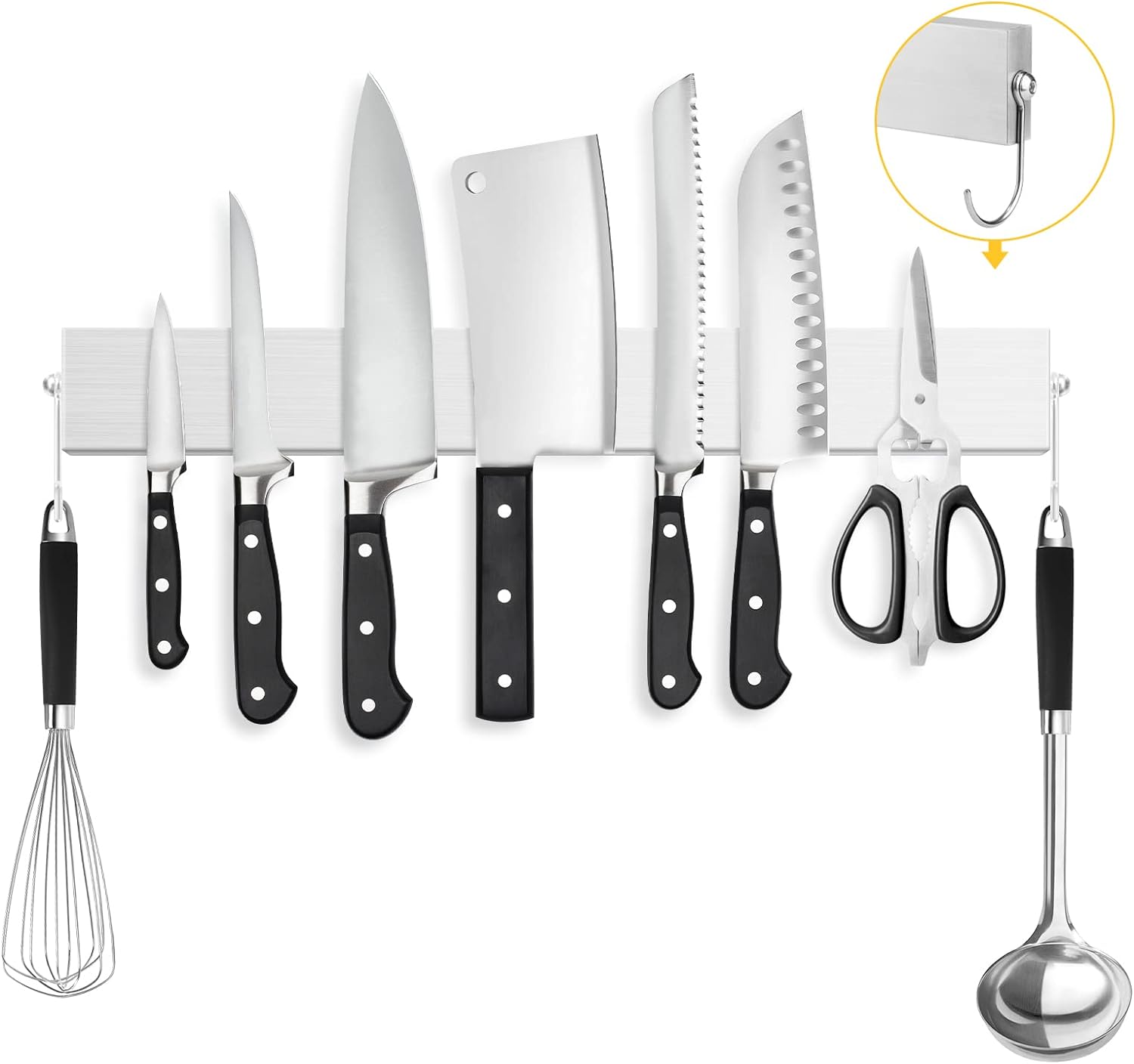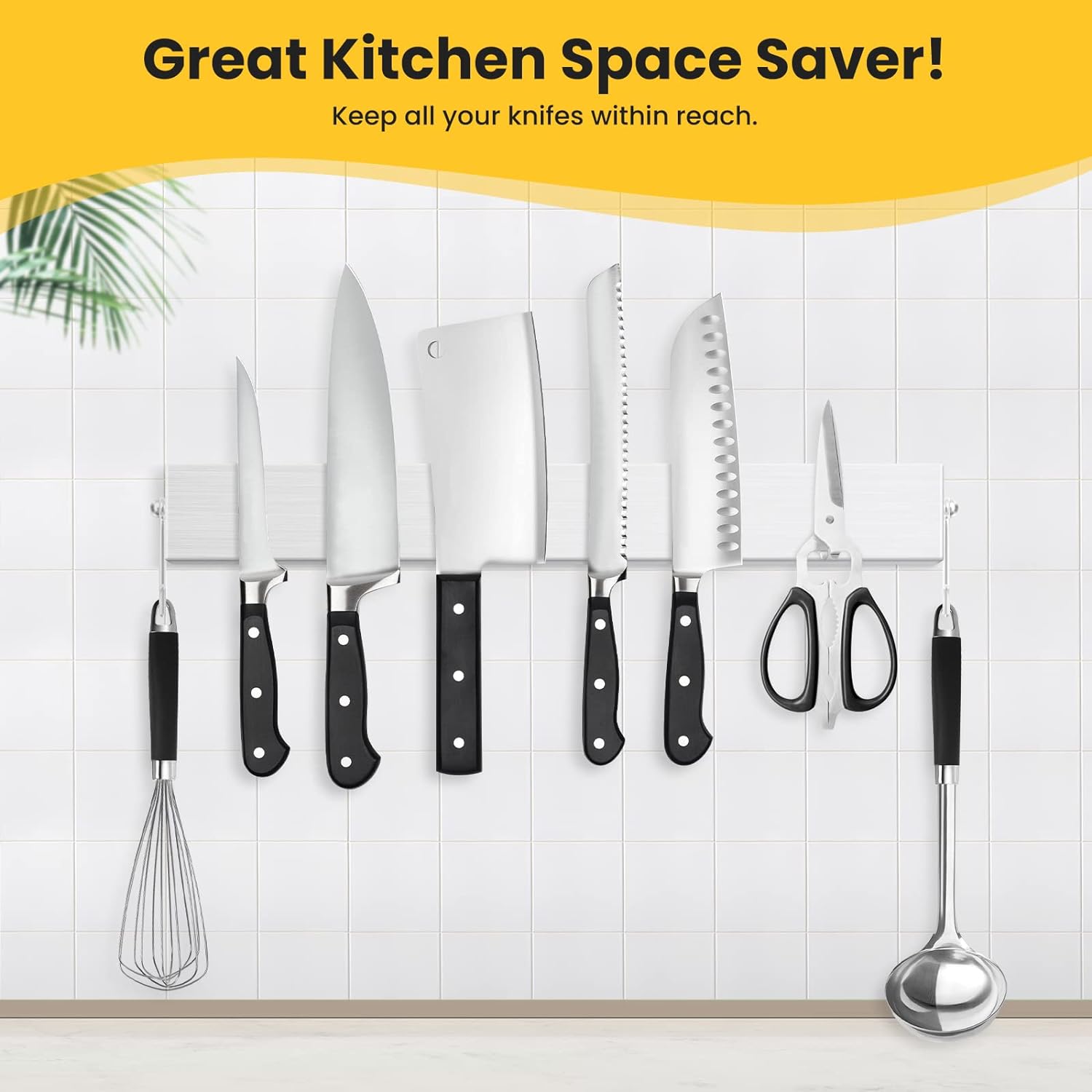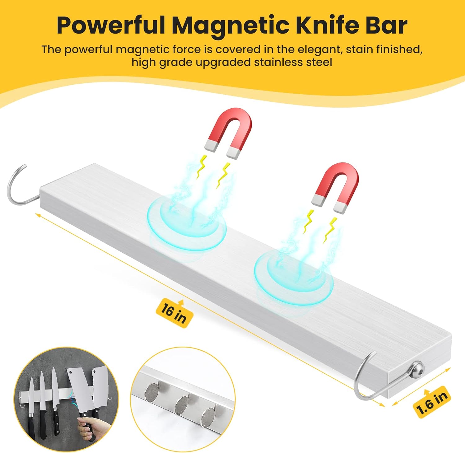 - [KNIFE HOLDER WITH POWERFUL MAGNETS] - The magnetic knife holder features powerful neodymium magnets with a full-strength magnetic surface to hold complete sets of knives and metal items securely in place. The 16-inch knife holder can hold more knives than most knife holders on the market.