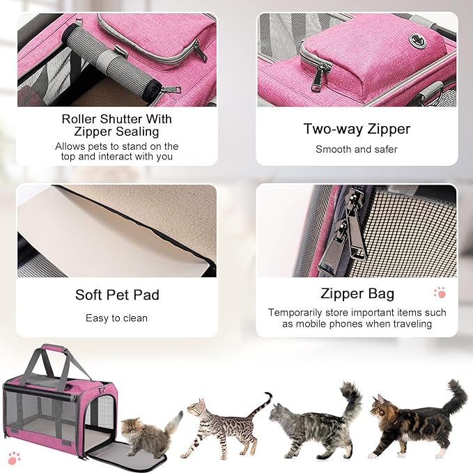 [THOUGHTFUL DESIGN]:] The cat bag is lined with soft pet cushion and filled with sponge inside, which is more comfortable, wear-resistant, practical and easy to clean. Designed with a roll-up and zip closure on the top, pets can stand or lie down on it to interact with their owners. The zip pocket on the top of the pet bag is designed for temporary storage of mobile phones and other important items when travelling.