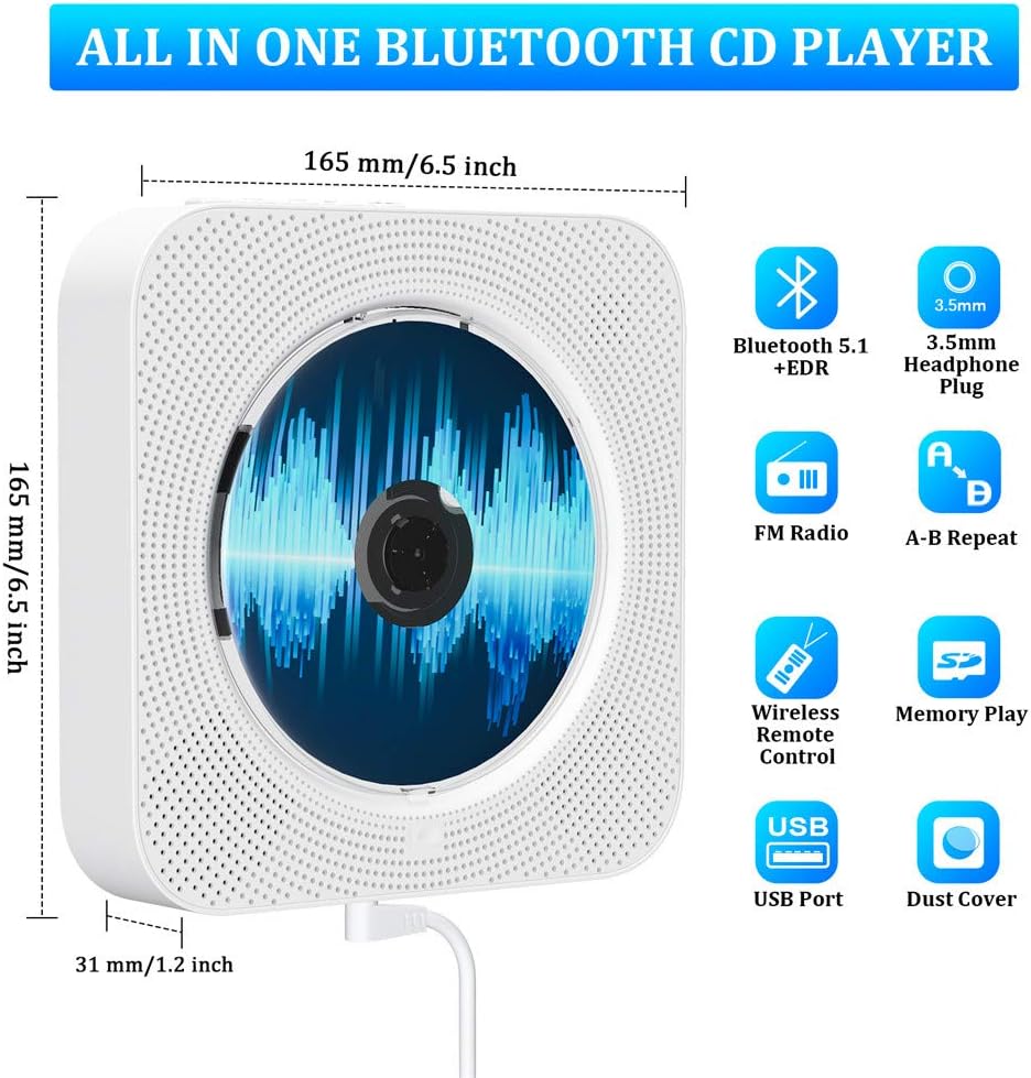 【Multifunctional CD Player】It can be used as a Portable CD Player, Bluetooth HIFI Speaker, FM Radio, Mini Home Boombox Music Player, USB Flash Drive Player, 3.5mm Audio Player, Alarm Clock. Widely compatible with CD, CD-R, CD-RW, MP3, WMA, WAV formats, play all kinds of CDs hassle free, built in Bluetooth and 3.5mm Aux in/out and headphone Jack, 1 USB port, supports USB flash