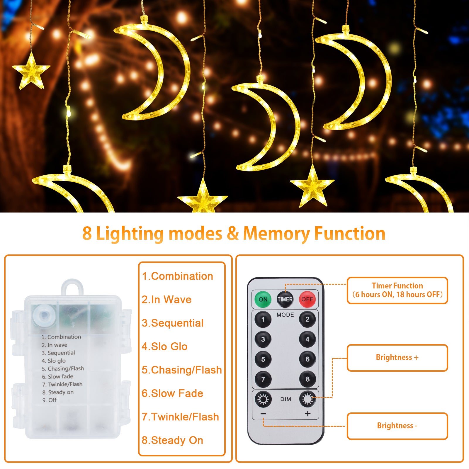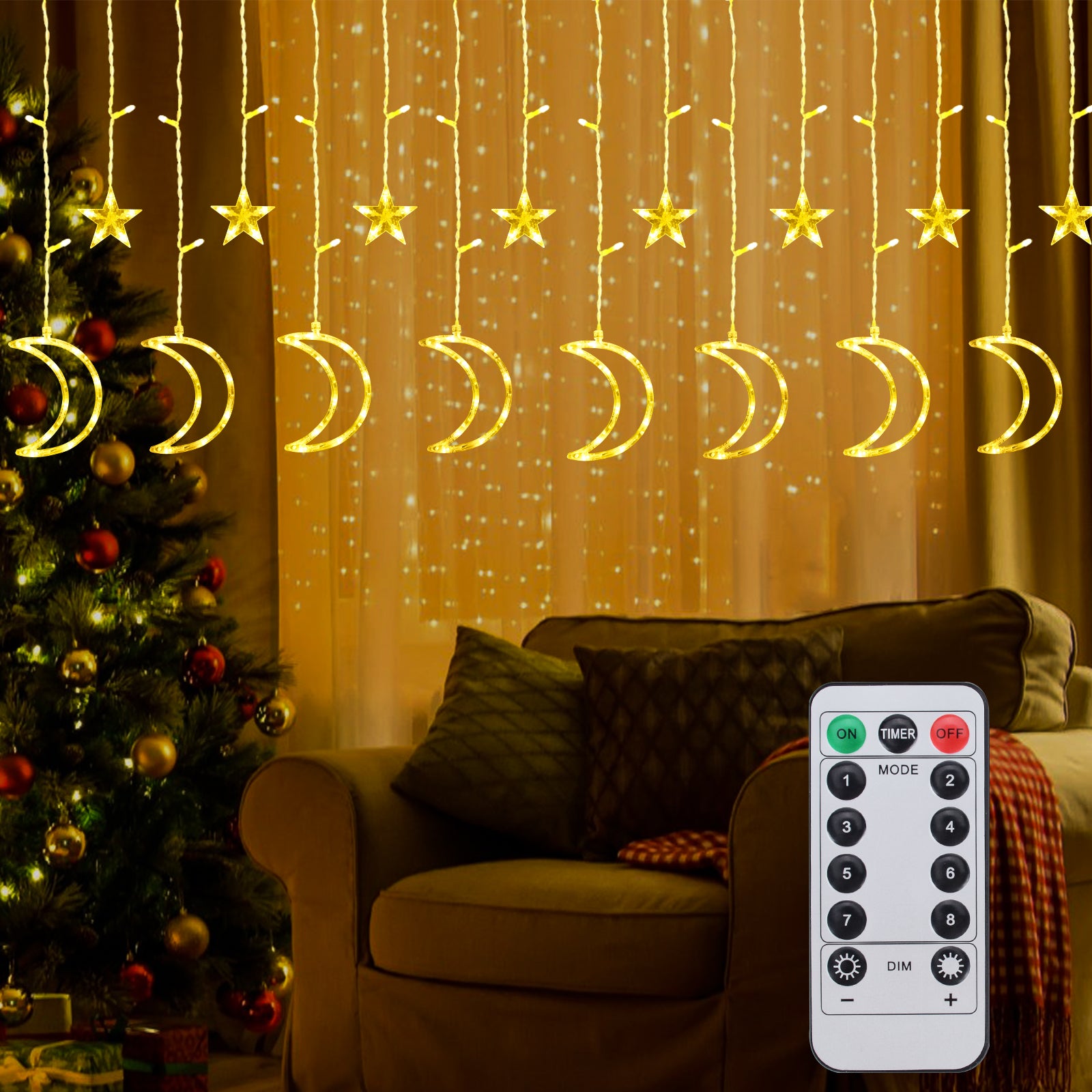 Qoosea 120 LED Curtain Lights, Moon Star Window Fairy String Lights, String Hanging Lights with Remote for Bedroom Backdrop Wedding Party Garden Indoor Decoration