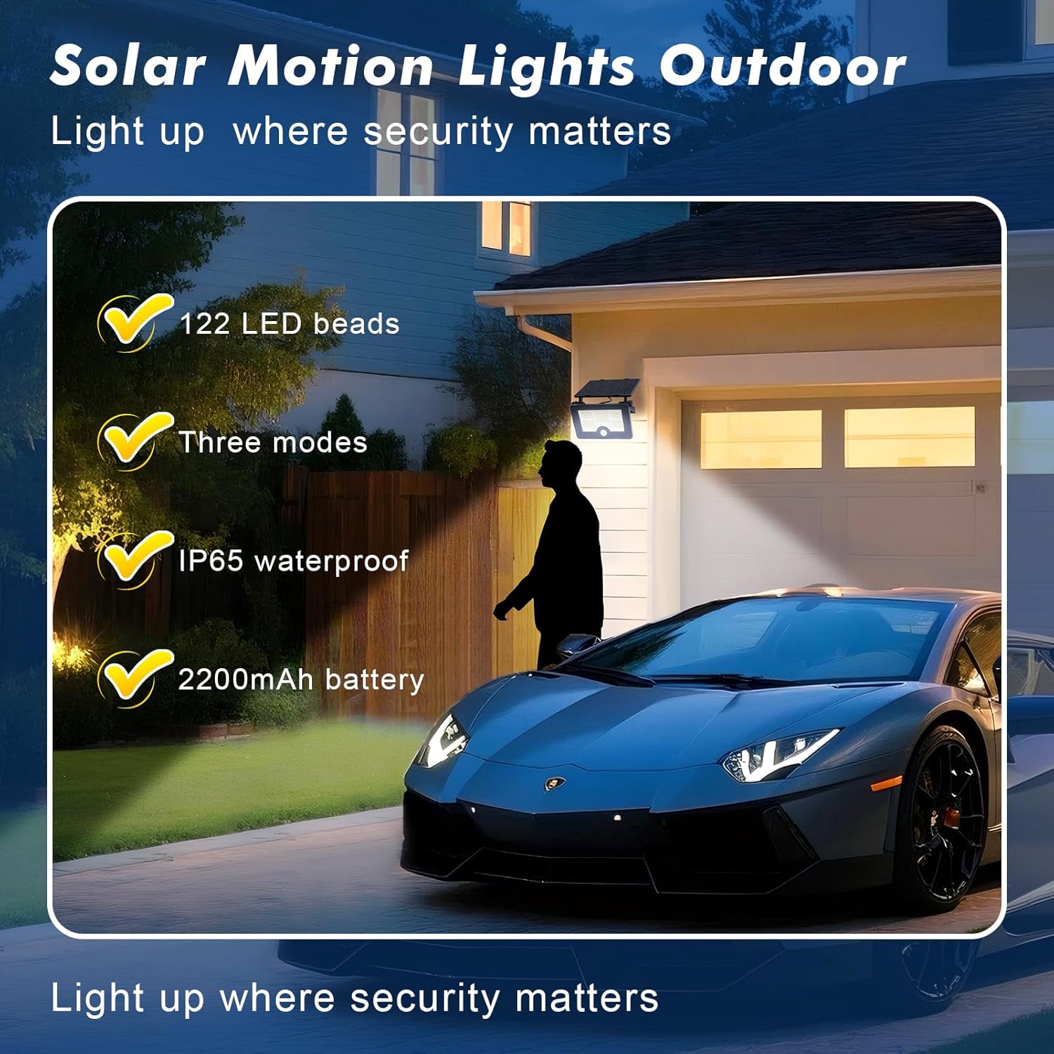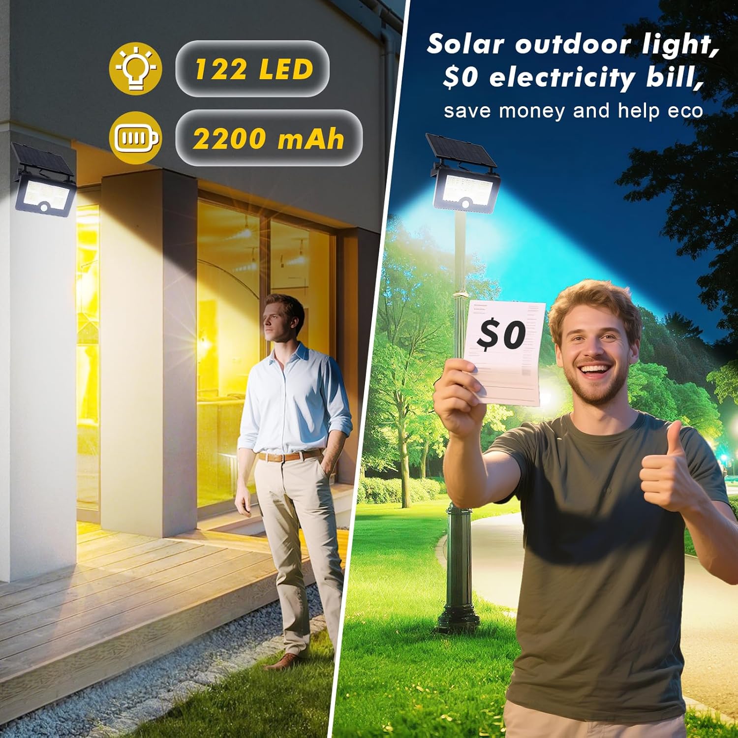 - 【Bright Solar Lights for Outside & Eco-Efficiency】Equipped with 122 high-lumen LED beads and a 2200mAh lithium battery, this solar light delivers 1100 lumens of brightness to light up 20㎡ areas, with 10+ hours of runtime after 6-8 hours of full solar charge. The monocrystalline solar panel ensures zero electricity cost, making it an eco-friendly choice for outdoor solar lights for patio, garden paths, driveways, or front doors.