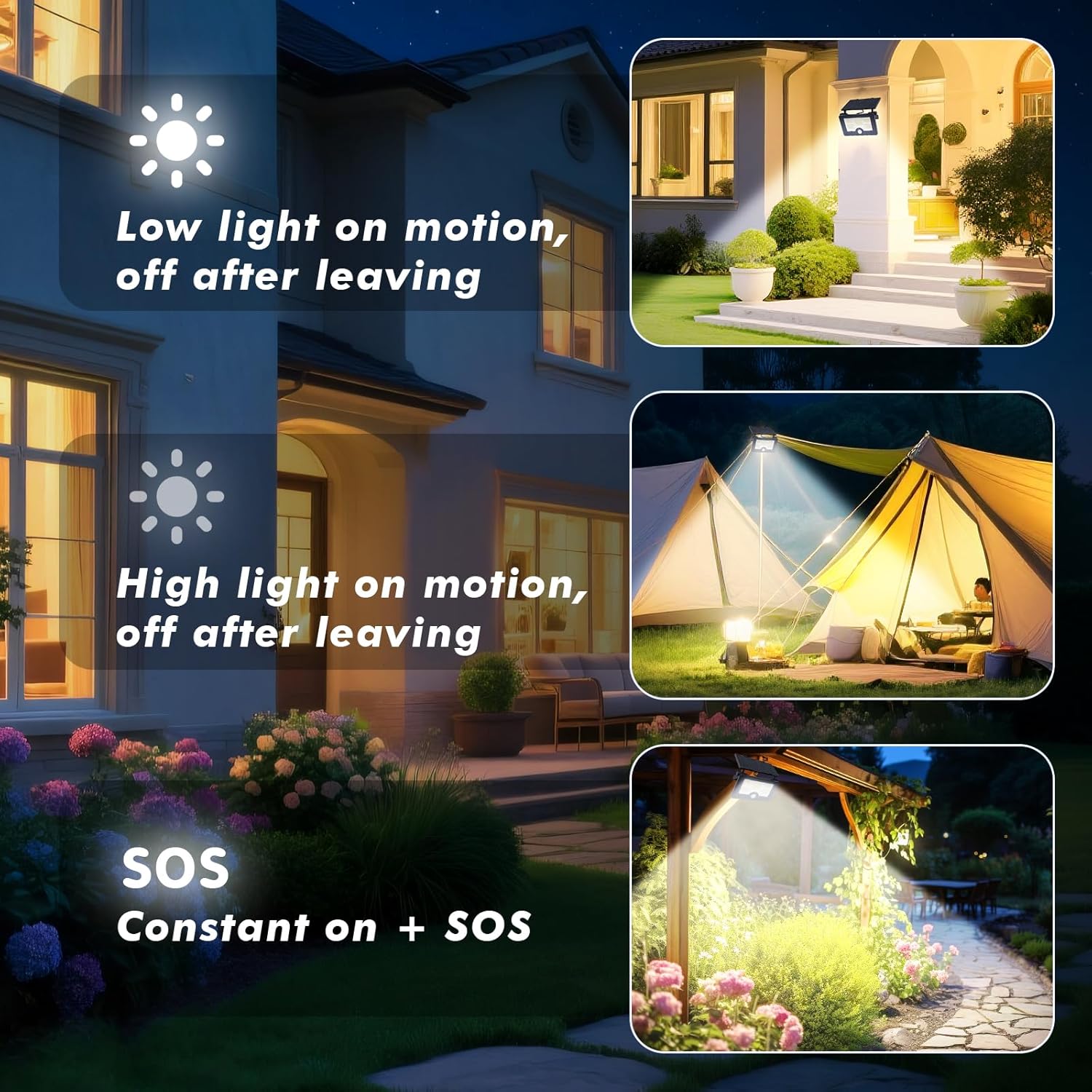 - 【3 Intelligent Human-Sensing Modes Selection】Customize lighting via three intelligent modes: ① Low-Brightness Mode activates on motion for pathway guidance, turns off after 10 seconds to save energy; ② High-Brightness Mode triggers bright illumination for security when strangers approach, auto-off after 60s; ③ Constant-on + SOS Mode for camping or emergencies, with rapid flashing SOS signal. Perfect for motion sensor outdoor lights in any scenario.