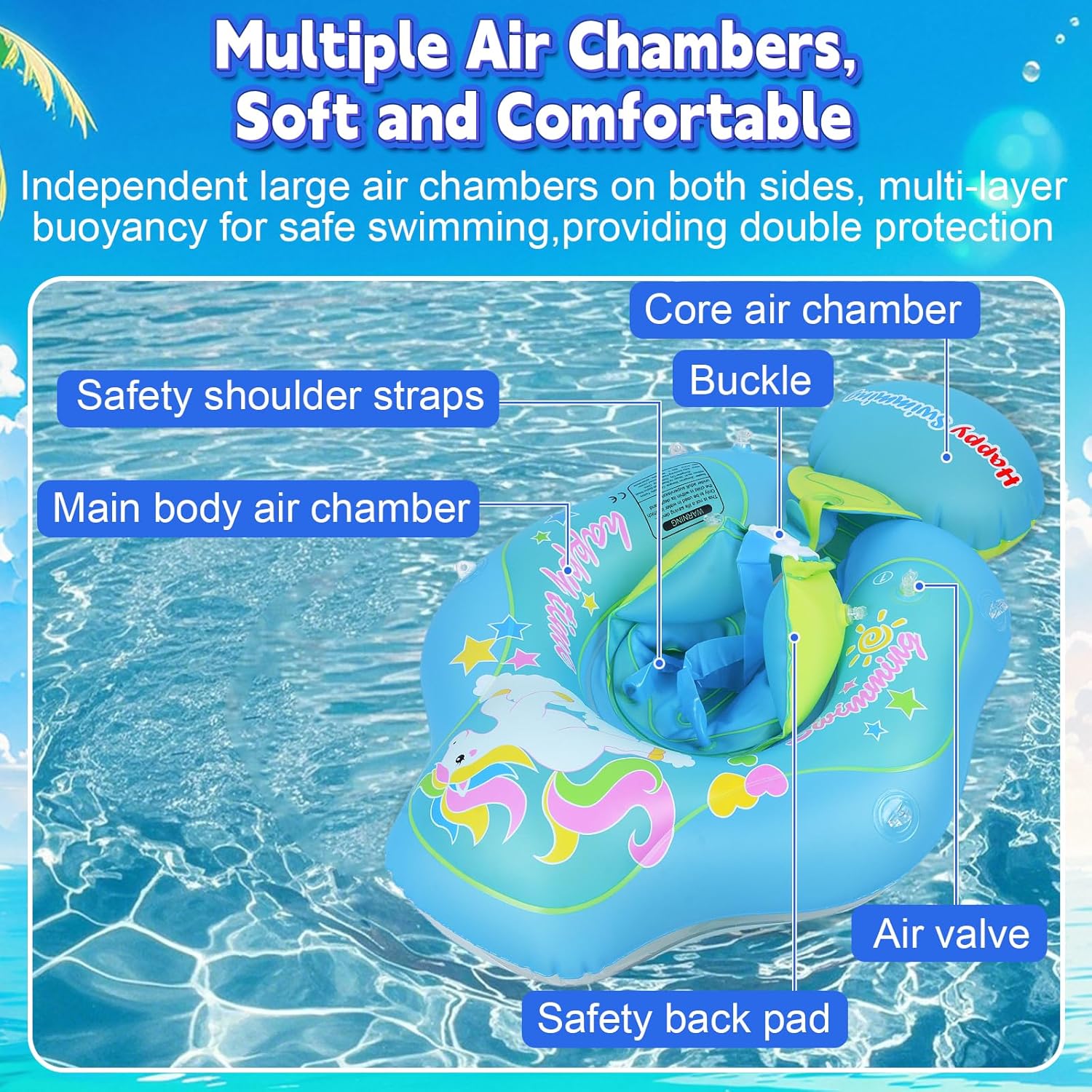 - 【Safety Design】This baby pool float is specially designed for babies aged 12-36 months. It features anti-tipping wing structures that significantly improve overall buoyancy. With independent large air chambers on both sides and a multi-layer buoyancy design, it offers double safety, allowing your baby to swim safely and worry-free in the water