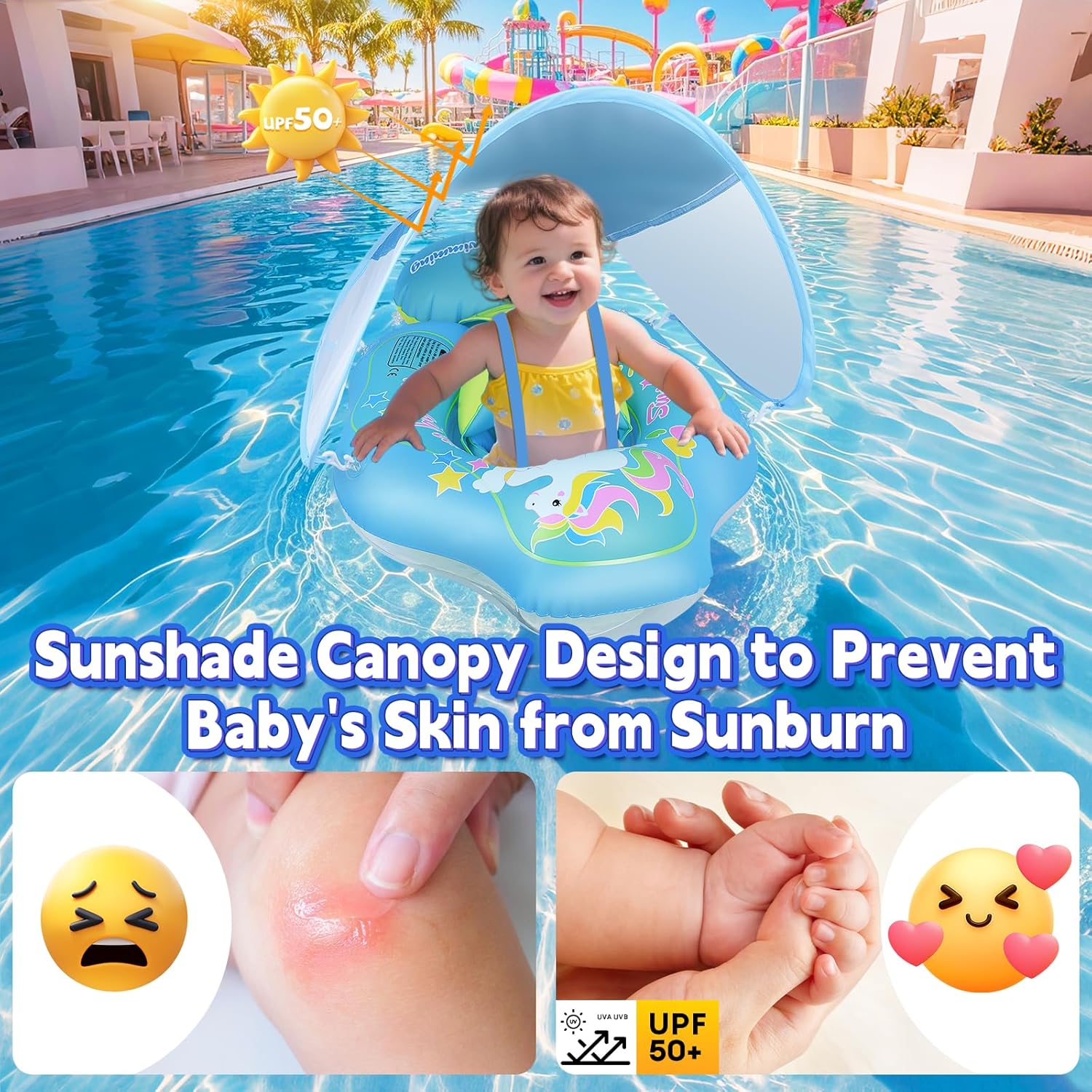 - 【Sunshade Canopy】Equipped with a detachable canopy, this baby pool float with canopy provides effective UV protection, making it ideal for outdoor pool use. The canopy is designed to be breathable, keeping your baby cool and comfortable while enjoying the water