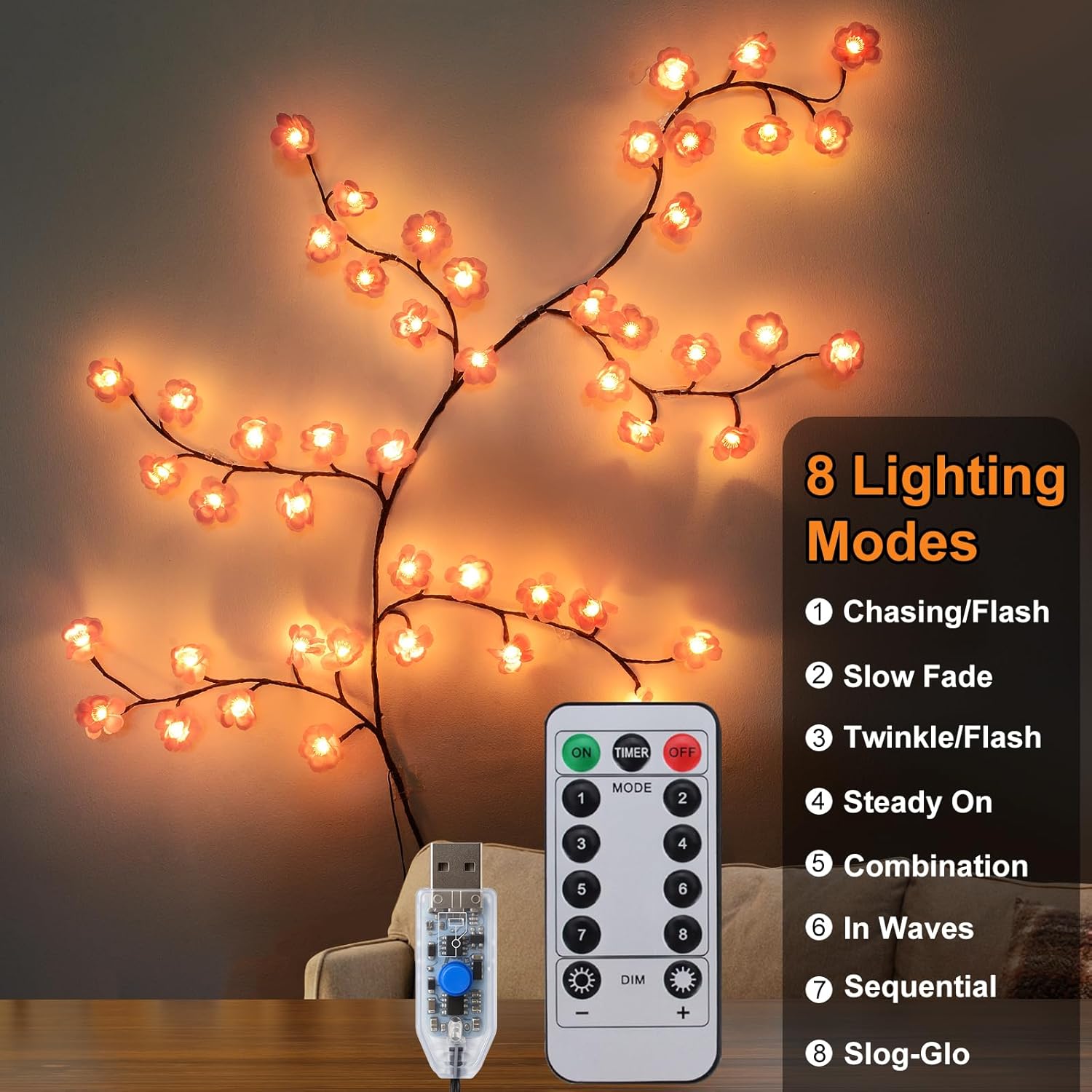 8 enchanting lighting modes and a timer: This LED cherry blossom branch light fixture features 8 lighting modes, including combination mode, wave mode, sequence mode, slow light mode, chase/flashing mode, fade mode, flashing/strobe mode, and constant light mode. It comes with a remote control for easy adjustment of lighting modes at any time.