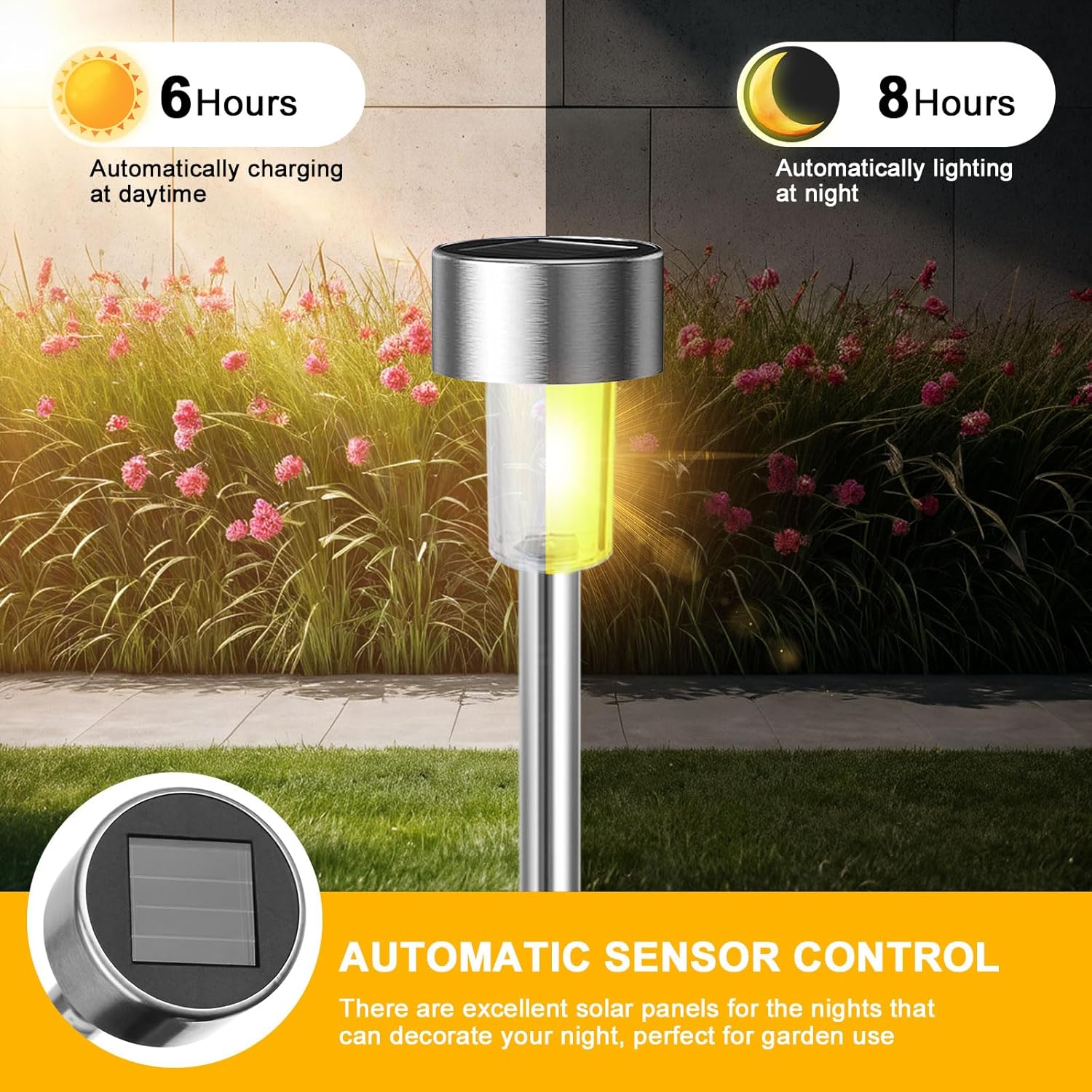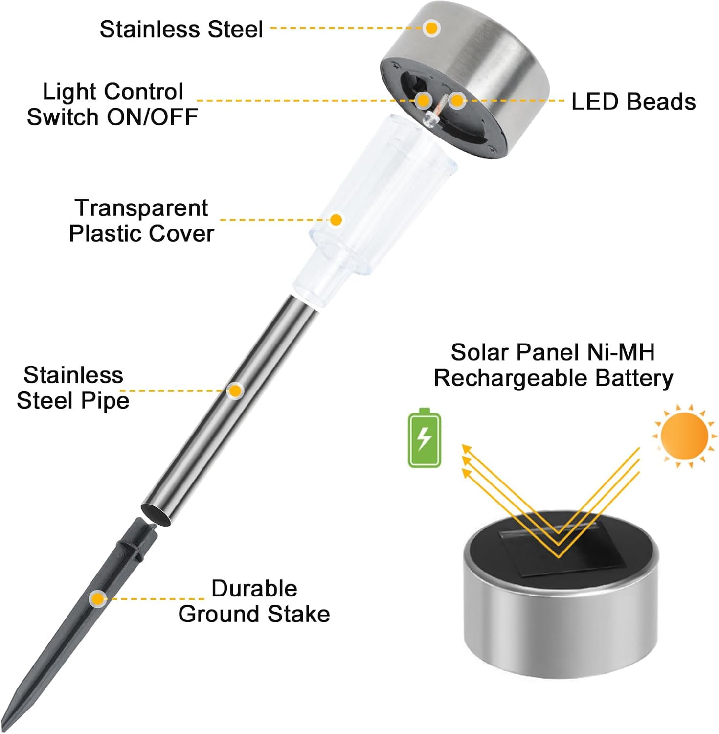 - 【Energía solar】Las luces solares Jardín se instalan con paneles solares, simplemente coloque los paneles solares a la luz solar directa para cargarlos, muy Ahorre dinero en facturas de electricidad. La lámpara proporciona una luz blanca cálida, perfecta para iluminar los senderos de su jardín.