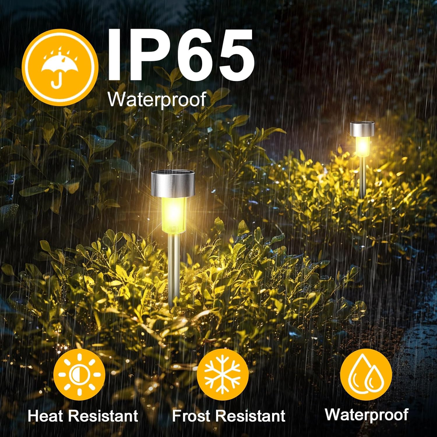 - 【IP65 Impermeable】No tienes que preocuparte por usar estas luces solares de jardín bajo la lluvia, nieve, heladas o aguanieve. Fabricadas con acero inoxidable y materiales ABS, las luces solares para postes son resistentes a la intemperie, al agua, a la corrosión, a los arañazos y al óxido para iluminar cómodamente su camino.