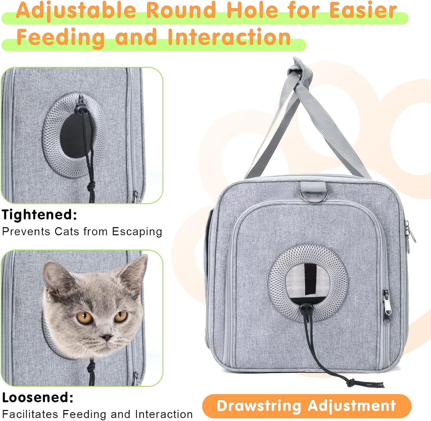- 【Comfortable and Practical】This pet carrier has a pet pad, providing a cozy resting environment for pets. The top is designed with a roller curtain that zips up for sealing, facilitating interaction between pets and their owners. There is also a convenient storage pocket outside, perfect for storing pet essentials such as food, water, and trash bags, making it both convenient and practical. The adjustable drawstring with round hole design allows for easy feeding and interaction with cats