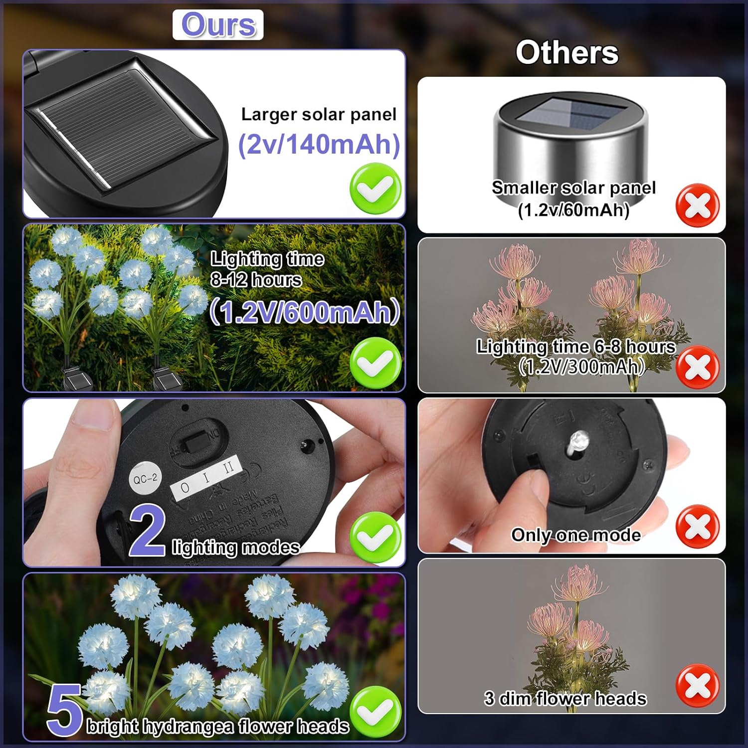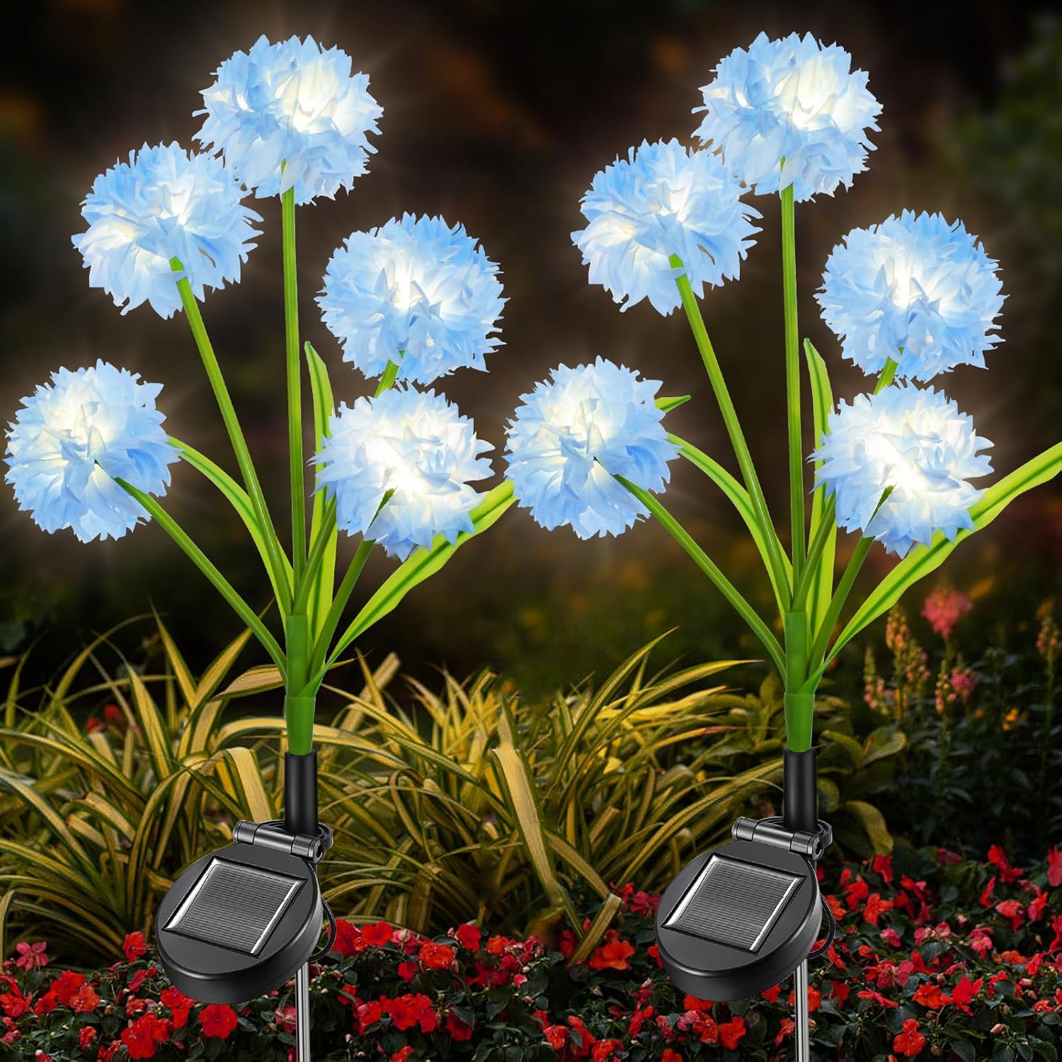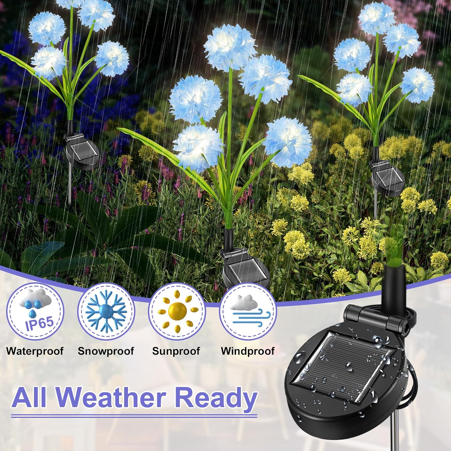 【Waterproof & Tough & Reliable】Crystal hydrangea decor lights is made of high-quality indelible silk cloth, stainless steel rod and ABS waterproof material. Solar garden lights are very reliable and can be used for a long time. Solar flower lights specially designed to withstand bad weather conditions, no longer worry about rain, snow, frost or sleet