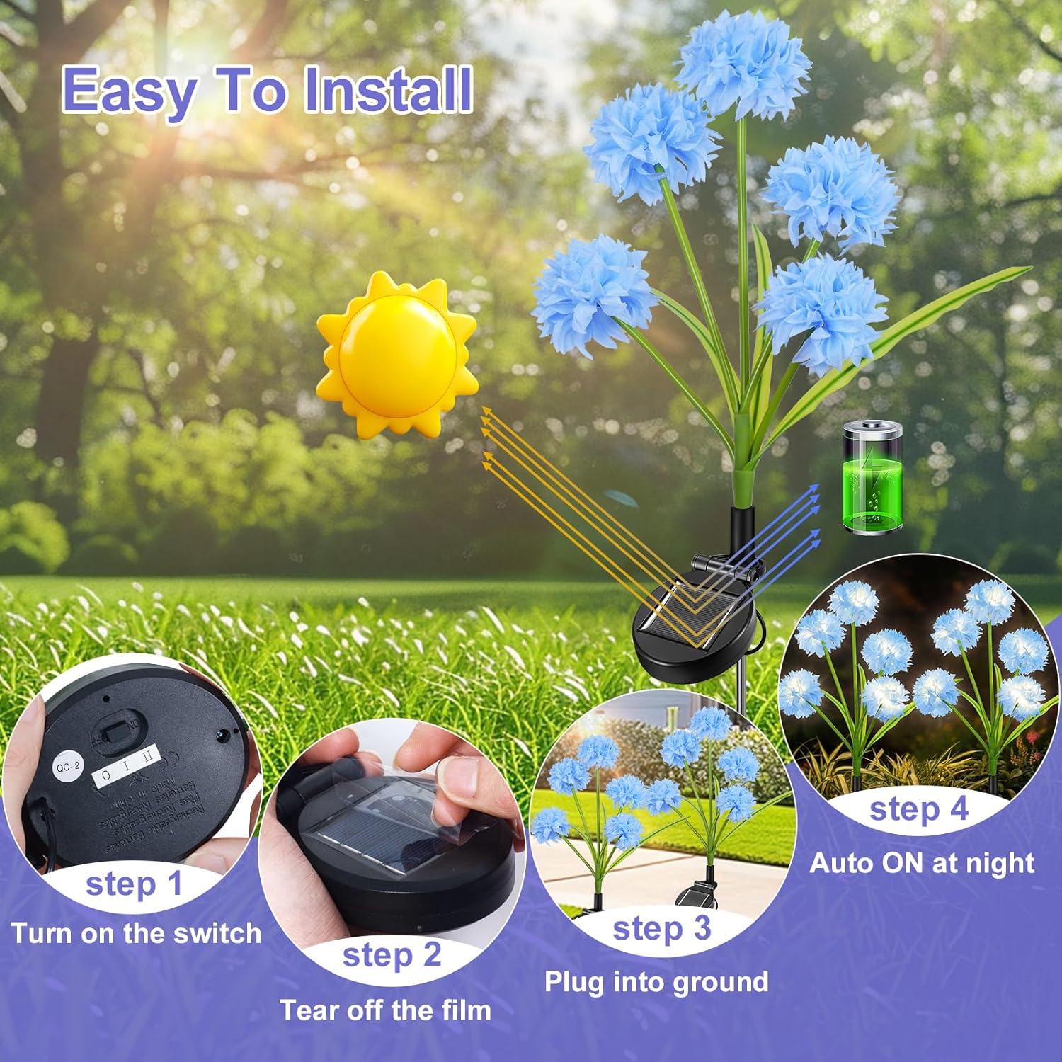 【Easy to Install】Outdoor solar lights for yard is very easy to install. You don't need plugs and tools, and you don't need to install wires. Just plant solar lights in your garden, and then turn on the switch to enjoy the romantic atmosphere brought by solar decorative lights. Note: Please make sure that it is installed in a sunny place