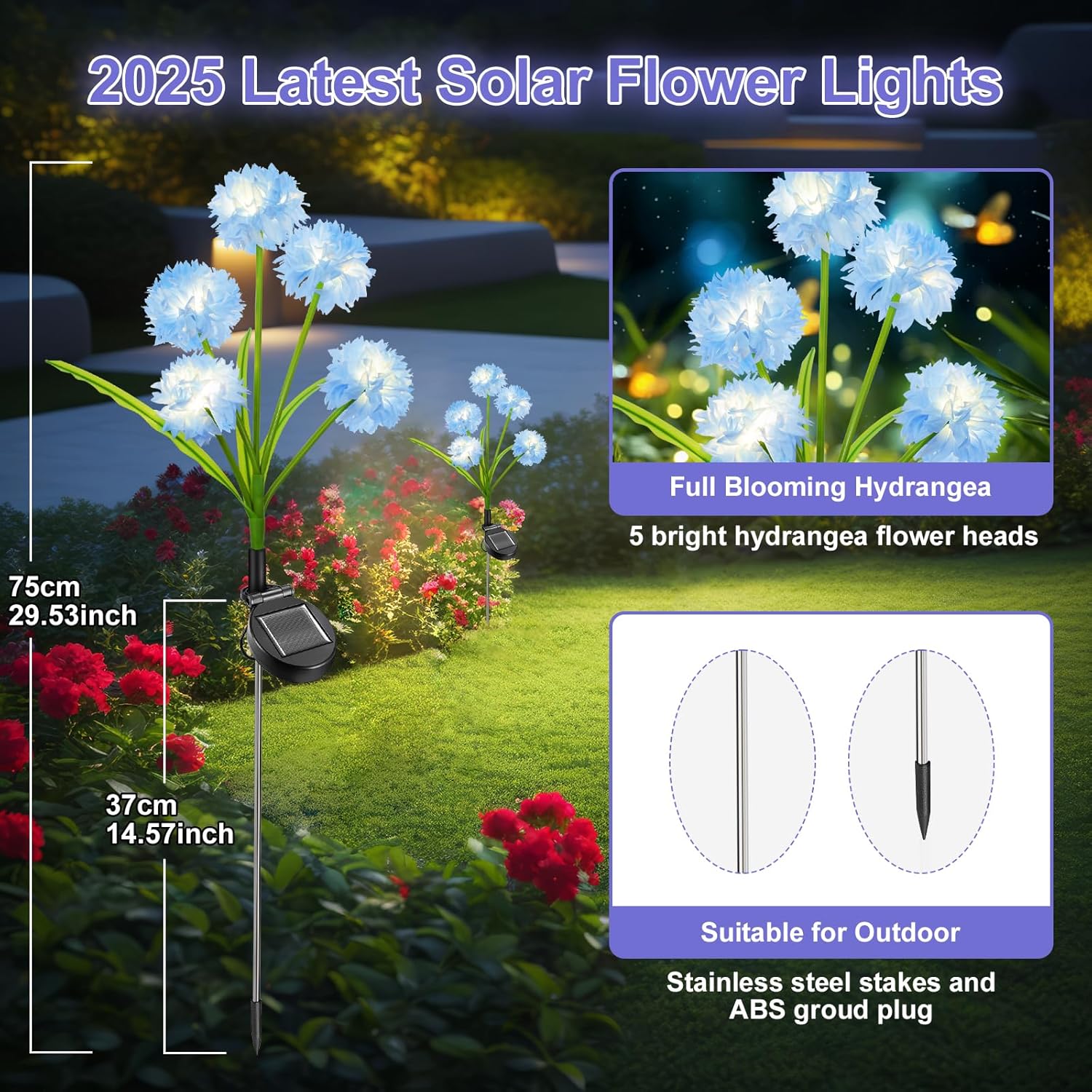 【Outdoor Solar Flower Lights】Our 2025 latest solar outdoor garden lights is made of high-quality silk cloth. A plant has five hydrangeas, and the petals are beautifully designed to imitate the crystal style, which looks more beautiful, unique and lifelike. Solar garden lights at night make your garden more vivid and pleasant