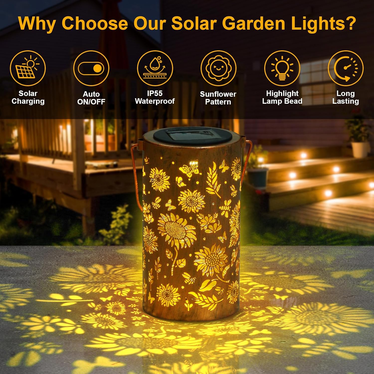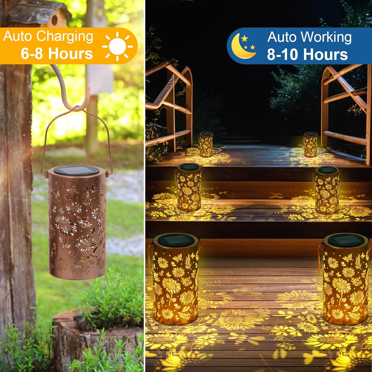 - 【Sunflower Decorative Design】The hanging solar garden lights are designed with retro hollowing out. In the dark, solar lanterns project bright and warm patterns of sun flowers, creating a gorgeous and warm atmosphere. Beautiful bronze solar lights add a touch of retro color to your garden and courtyard