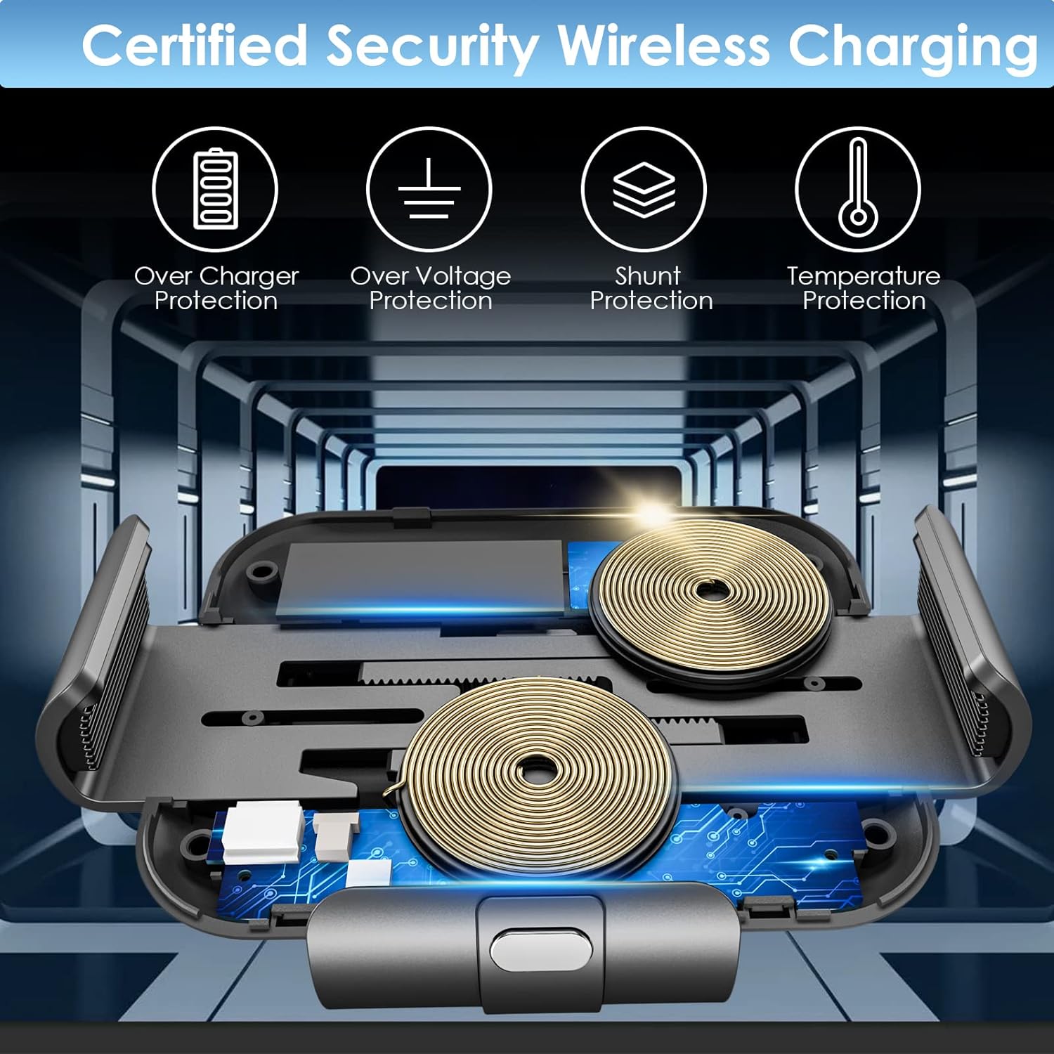 Dual coil fast wireless car charger: Dual coil phone charger, the car phone charger can quickly charge your phone to ensure your best experience. This wireless car charger with built-in smart chip can protect your phone from over-charging, over current, short circuit, high temperature, etc.