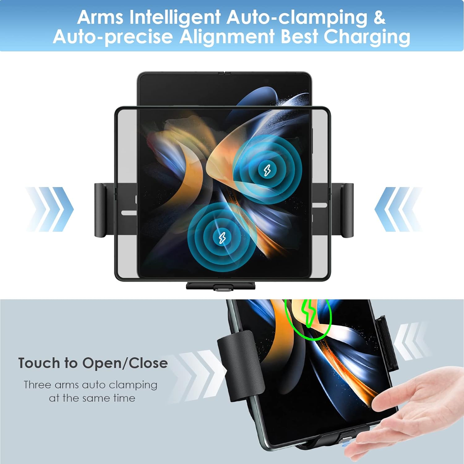 Auto Lock: Press the release button on the wireless phone holder and it will automatically unlock your phone and start charging. Easily place your Samsung Galaxy Z Fold 4/3/2 horizontally or vertically, and place your phone vertically to easily adjust the phone volume keys and lock keys.