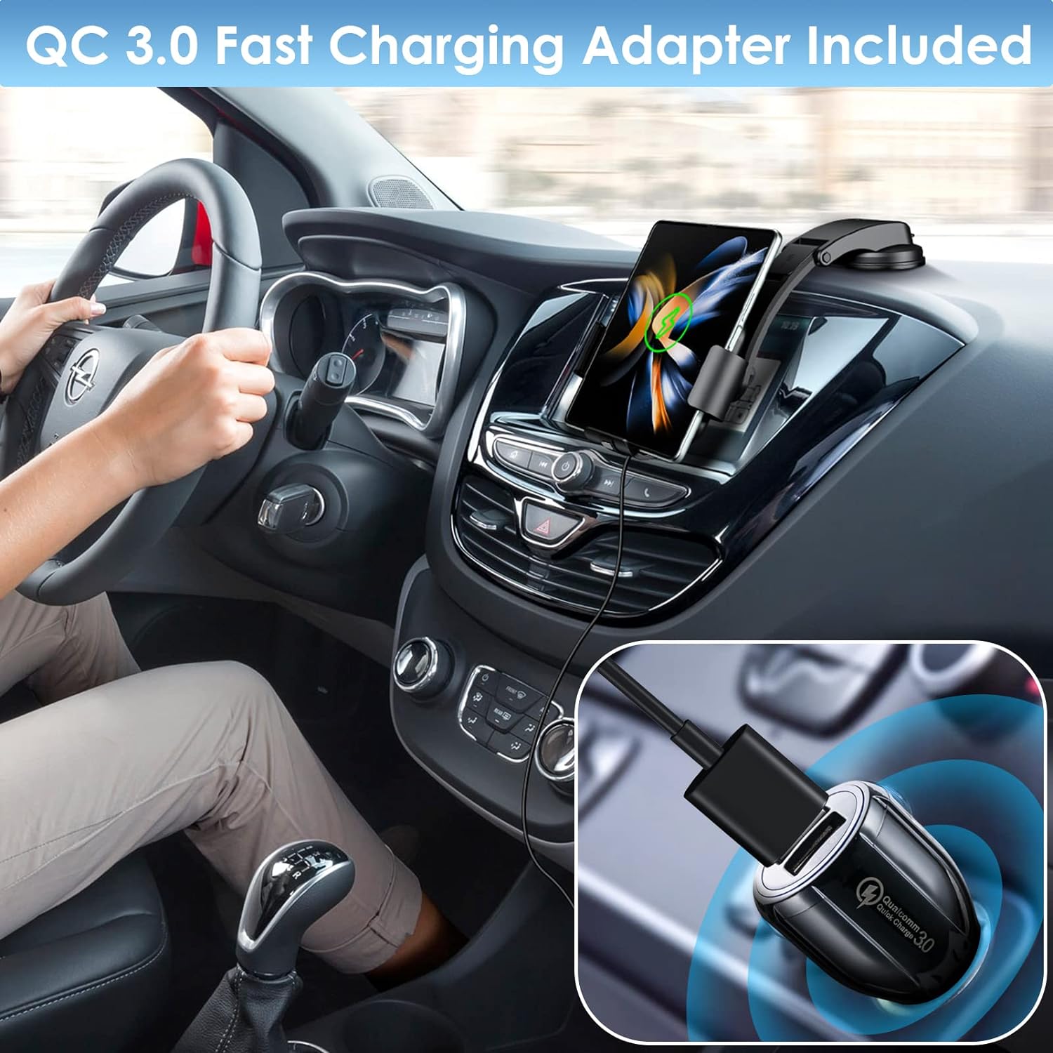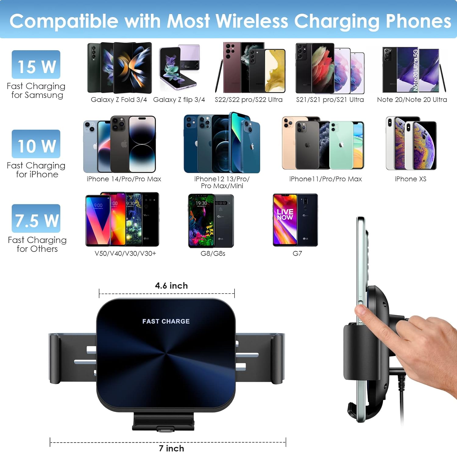 Wide Application:Compatible with all Qi charging phones 4.3 " - 6.9", for Samsung Galaxy Fold 4, Fold 3/2, Note20/20 Ultra/10/9/8, S22/S22 Ultra/S22 +/S22 +/S21/S21 Ultra/S21 +/S20, iPhone 14/14Pro/14 Pro Max/13/13 Pro/13 Pro Max/12/12 Pro/12 Pro/12 Pro Max, Huawei, Google 6A/Pro/6, LG, Moto. Built-in capacitor, even though your car is off, you can still take out your phone from the car charger 1-2 times.