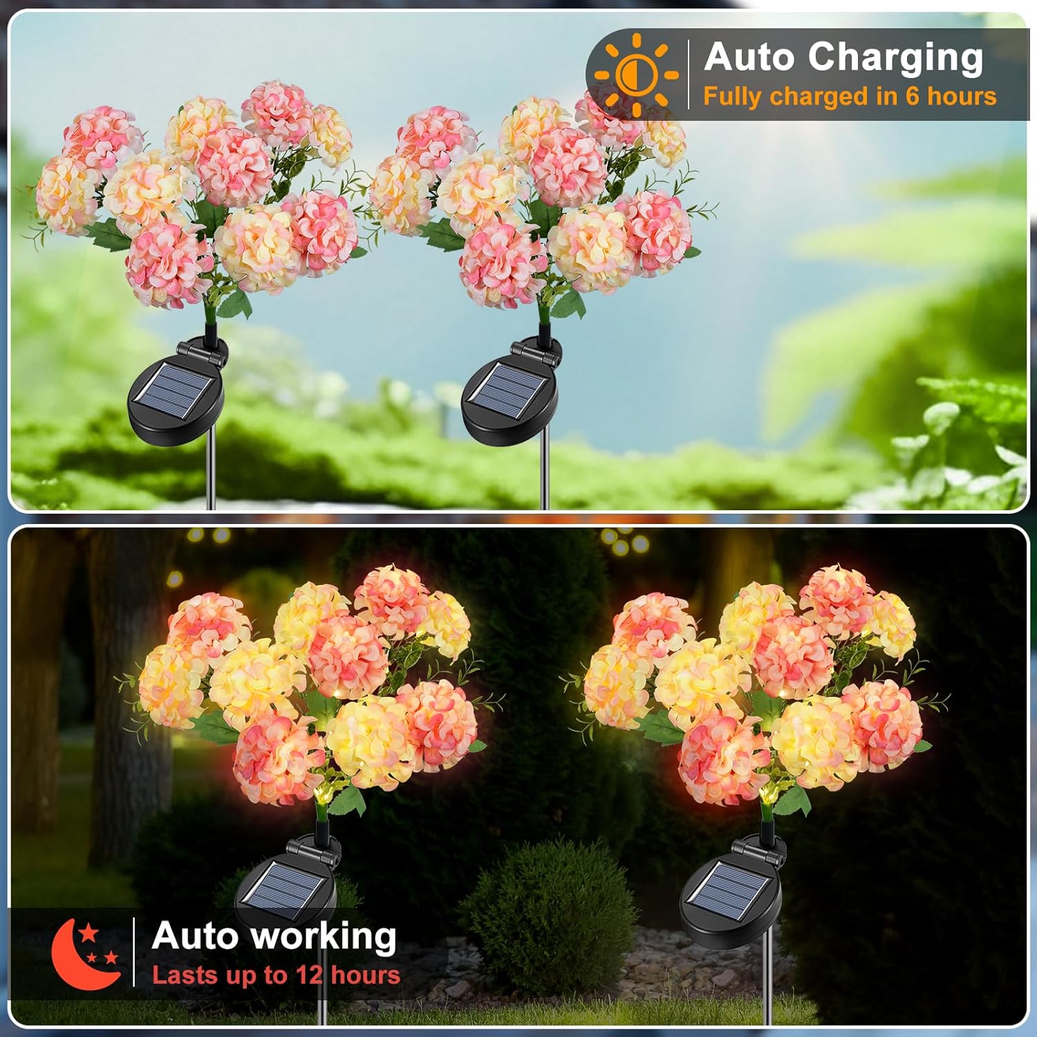 - 【Outdoor Solar Garden Lights】 This solar garden lights, unlike other products on the market that only come with 5 hydrangea flowers, our garden lights has 10 flowers in one plant with lifelike petals that look like freshly bloomed flowers. Moreover, the stems of the flowers are also cleverly matched with LED beads, when the night falls, the lights come on, creating a dreamlike and beautiful mood, making your garden instantly become the focus of attention in the neighborhood.