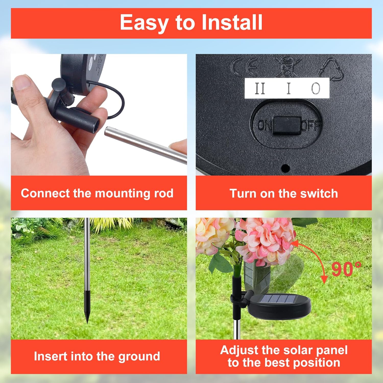 - 【Easy Installation】The installation process of this outdoor garden solar light is simple. Simply connect the solar light to the stainless steel pole easily, and then firmly insert it in your preferred location in the garden. Turn on the switch, and you can enjoy the romantic atmosphere of the solar decorative light in an instant. Truly realize plug and play, convenient and quick.