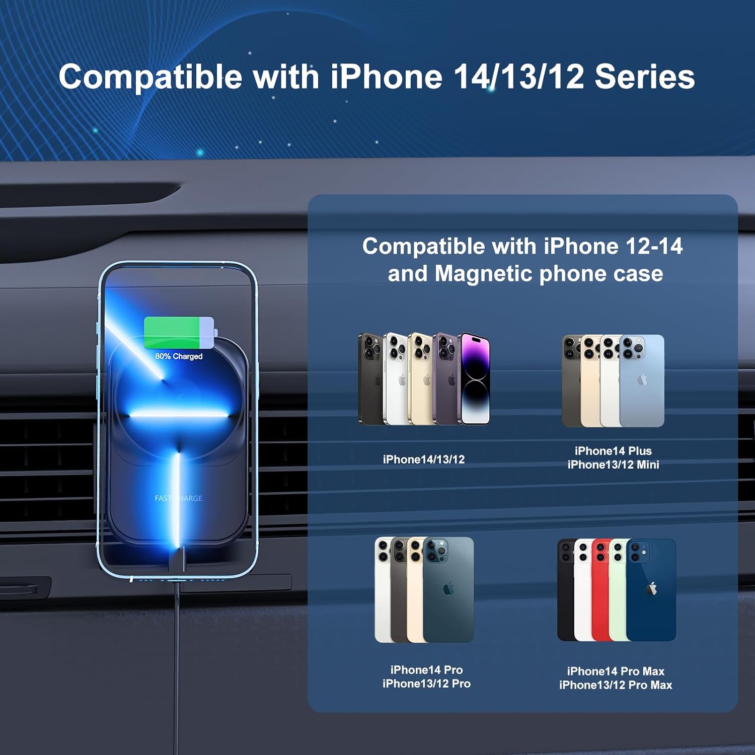 【Wide Compatibility】This magnetic car mount wireless charger is compatible with all phones that support wireless charging especially the latest iPhone15/14/13/12 Series, including iPhone 15/15 Plus/15 Pro/15 Max/15 Pro Max/14 Pro Max/14 Pro/14/13 Pro Max/13 Pro/13/12 Pro Max/12 Pro/12/12 mini. When you use an iPhone 11,10,9 or the more older generations, you need to equip yourself with a magnet for your phone. you need to use the QC 3.0 car charger (included)