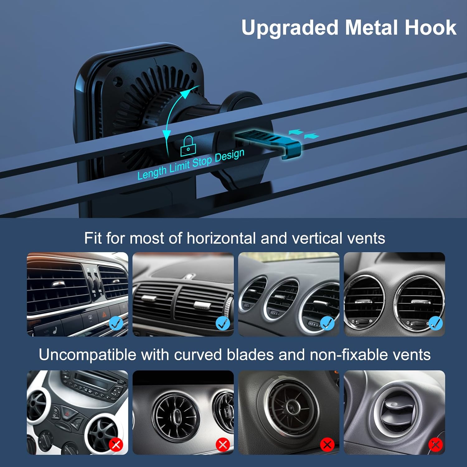 【Upgraded Anti-Shake Air Vent Clip】The mag safe car mount adopts an upgraded air vent clip to provide stronger support, allowing your iPhone to be firmly fixed on the air vent without falling off. You can adjust the tightness of the telescoping hook to lock the power exhaust blade. Also, it fits most car vents, including round, horizontal and vertical vents, not for swivel vents.