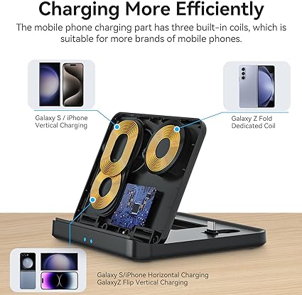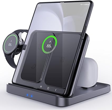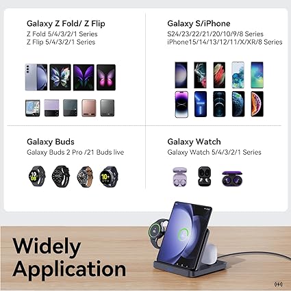 WIDE COMPATIBILITY: The charging station is compatible with all Qi-Enable wireless phones - Samsung Galaxy Z Fold 5/4/3/2, Z Flip 5/4/3/2, iPhone 15/14/13/12/11 pro, pro max/Xs/Xr/X/8/7, Samsung S24/S23/S22/S22+/ S22Ultra/S21/S21+/S21 ultra/S20/S20+/S20ultra/S10/S9/S8/Note20/9/8, compatible with Galaxy watch 6/5/4/3/Active 2/1. Headphones: Galaxy Buds 2 Pro, Buds2, Buds Live/ Pro