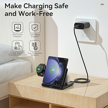 3-in-1 Wireless Charger 15W Inductive Charging Station: A creative combination for charging Samsung mobile phones, Galaxy watches and headphones at the same time, simply place multiple devices on the wireless charging station to enjoy fast wireless charging and use it as a mobile phone stand. It is also compatible with Google/Android phones.